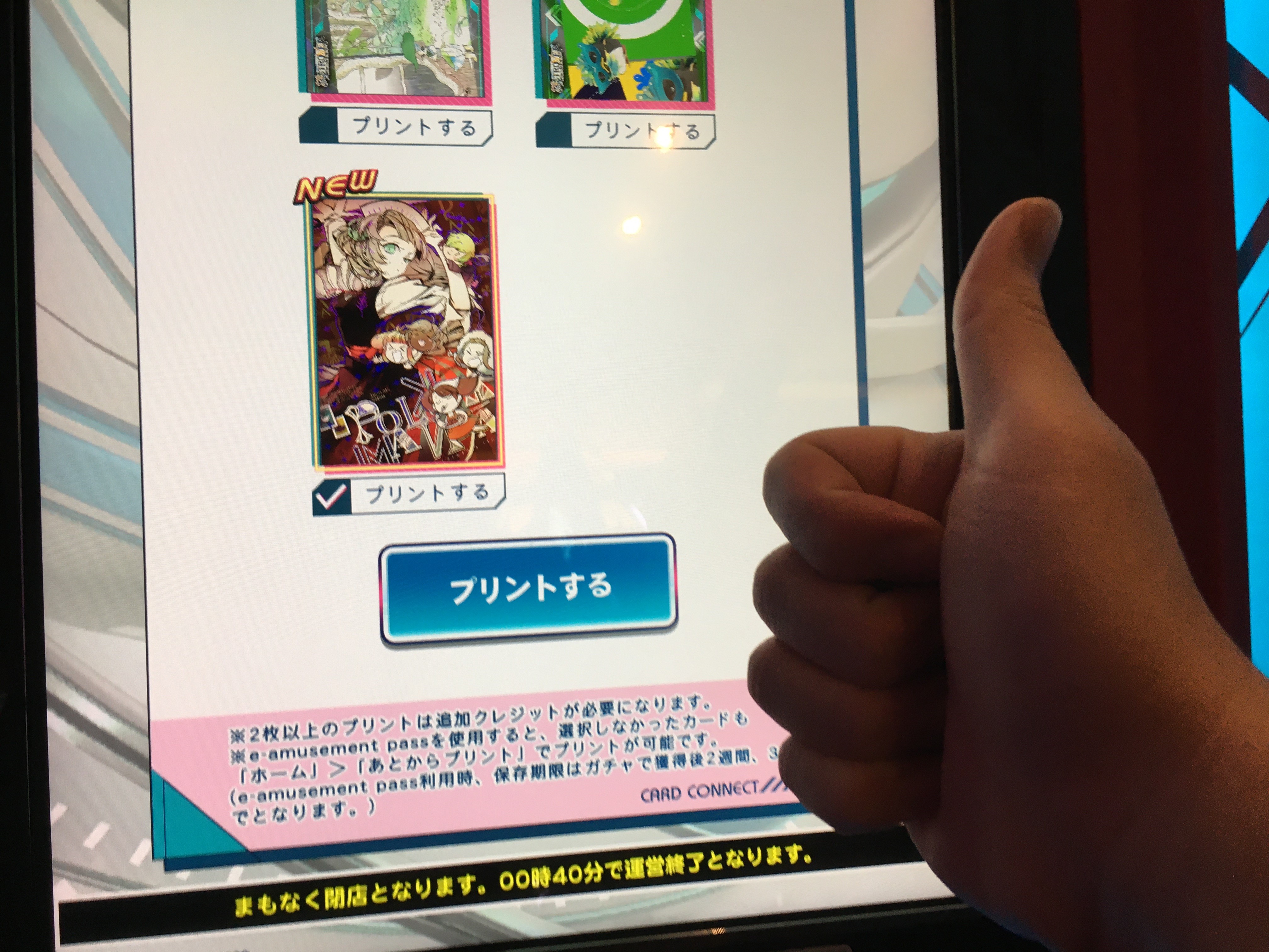 폐장 시간이 임박할 때까지 실컷 게임을 하고 남은 돈으로 '카드 커넥트'에서 가챠를 돌려 비트매니아 IIDX의 캐릭터 카드를 뽑았다. 총 2,000엔을 한꺼번에 모두 투자했는데 레어 카드만 5장을 뽑아서 나름 괜찮은 수확을 거뒀다.