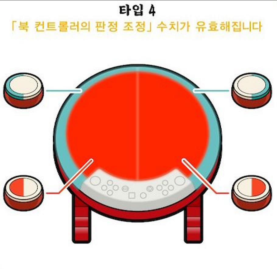 이 게임의 조작계는 양손에 각각 채를 들고 터치 스크린 또는 테두리 프레임을 두드려 화면 중앙에서 4방위로 뻗어 나오는 노트를 처리하는 식인데, 나오는 노트의 생김새에 따라 채로 두드려야 하는 부위가 구별된다. 노트가 4방위로 나오는 것을 제외하면 조작계의 특성은 마치 '태고의 달인' 시리즈와 흡사하다.