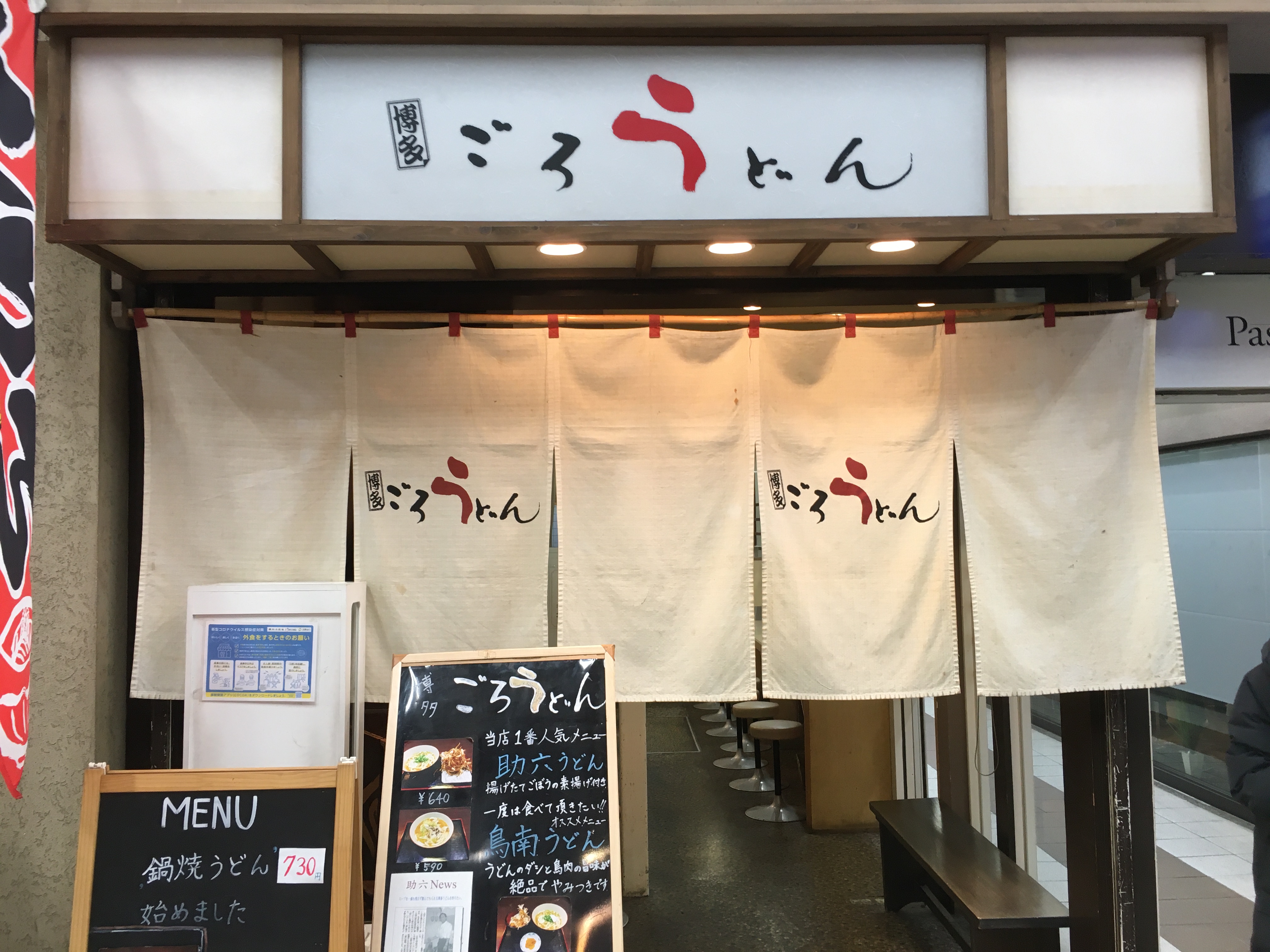 신텐쵸 상점가에 위치한 하카타 고로우동. 글 작성 시점 기준 타베로그 평점 3.29점으로 그럭저럭 괜찮은 평을 받고 있는 이 지역의 전통식 우동집이다. 아무래도 현지인들이 주로 찾는 작은 가게이기 때문에 이전에 봤던 이치란라멘이나 요시노야 같은 체인보다는 외국인 관광객을 배려한 요소가 상대적으로 적다.