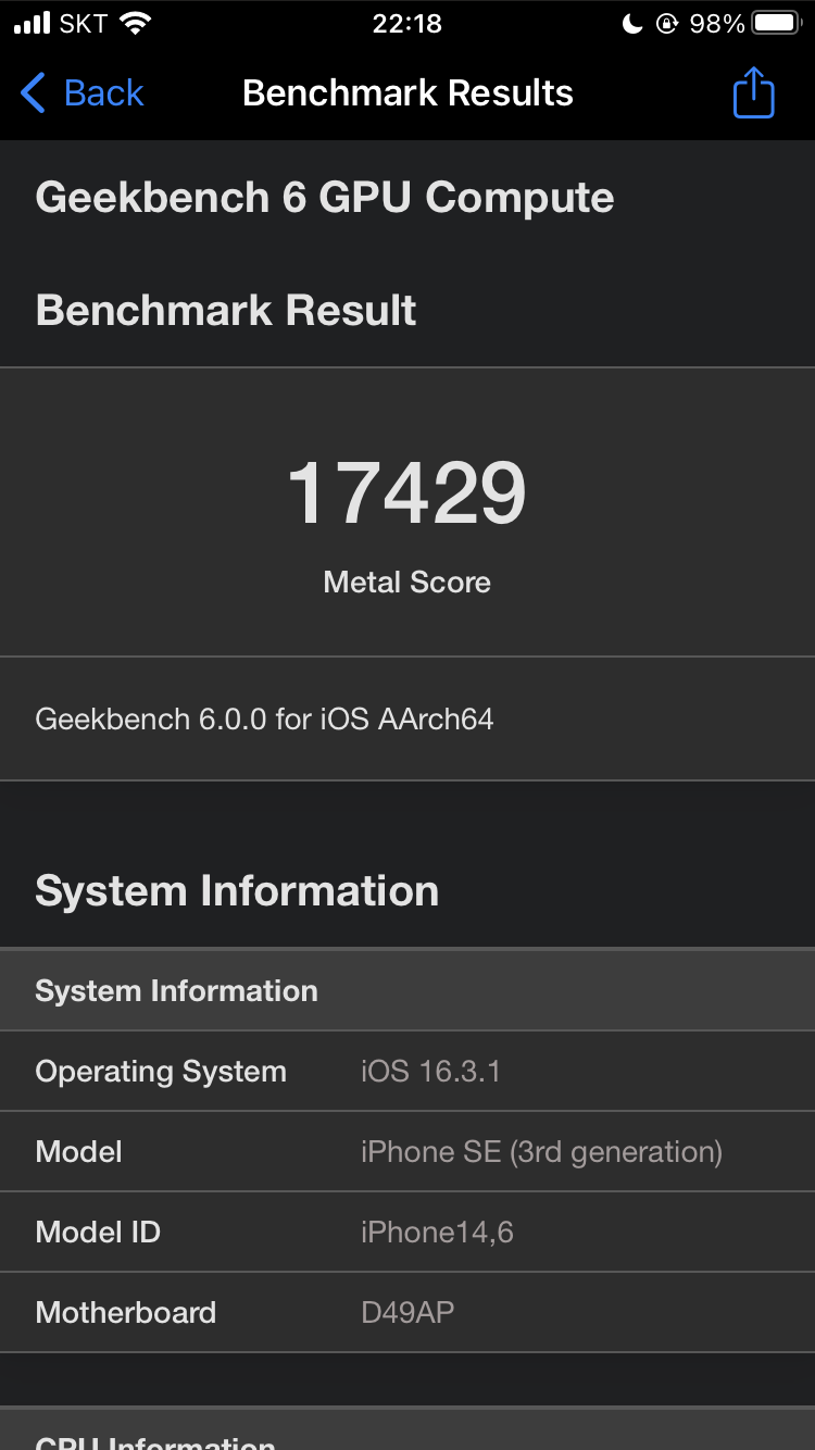 똑같이 A15 바이오닉을 탑재하고 있는 아이폰 중에서도, 구형 폼팩터를 채택하여 13보다도 성능 발휘 측면에서 이점이 큰 아이폰 SE3와 긱벤치 6 벤치마크 점수를 비교해 보았다.