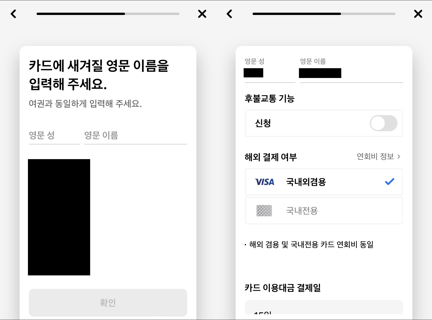 6. 카드 발급에 필요한 정보 및 옵션 입력 (영문 이름, 후불교통, 해외결제 등)