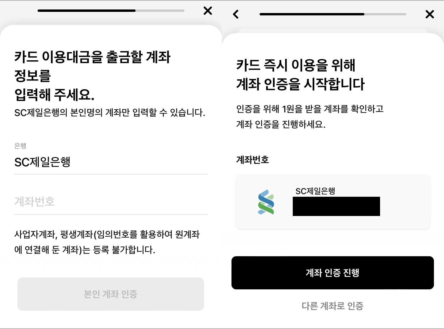 7. 이용대금이 출금될 계좌 정보 입력 (당연히 SC제일은행 계좌만 가능)