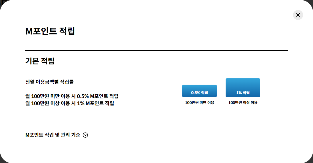 이 카드를 비롯한 M/X 시리즈의 공통적인 혜택 특성을 간단하게 요약하자면 "카드를 긁어서 나한테 떨어지는 게 포인트(M)냐 캐시백(X)이냐" 둘 중 하나다. 자세한 혜택은 카드사 사정에 의해 때때로 변동될 가능성이 있기 때문에 굳이 여기에 고정된 내용으로 열거하지는 않겠다. 궁금하다면 아래에 링크한 공식 사이트의 내용을 참조하시라.