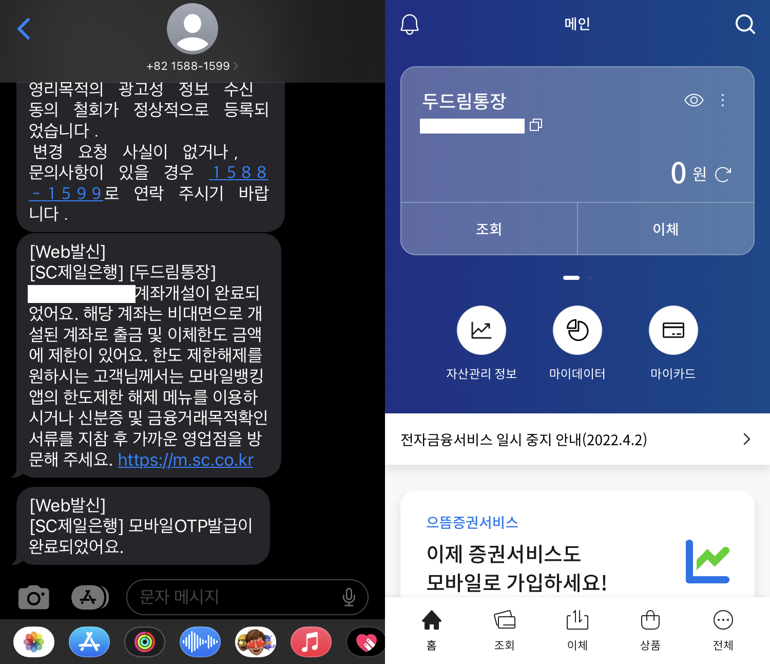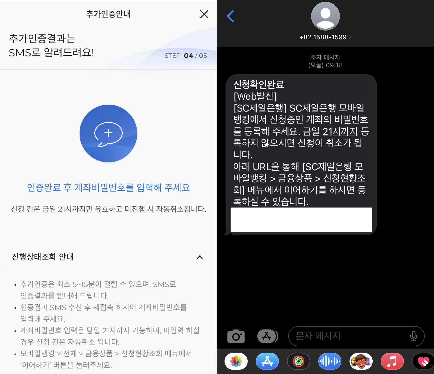 7. SMS로 추가 본인인증 결과 안내. 오른쪽 사진과 같은 SMS 메시지를 받아야 계좌 개설 과정을 계속 진행할 수 있음.