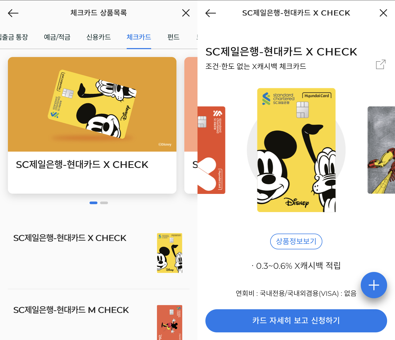 2. 'SC제일은행-현대카드 CHECK' 상품 선택 후 [카드 자세히 보고 신청하기]