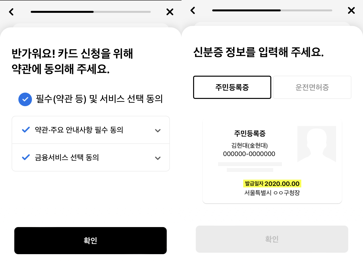 아래에는 모바일 환경에서 입출금계좌와 체크카드를 발급하는 일련의 과정을 담았다.