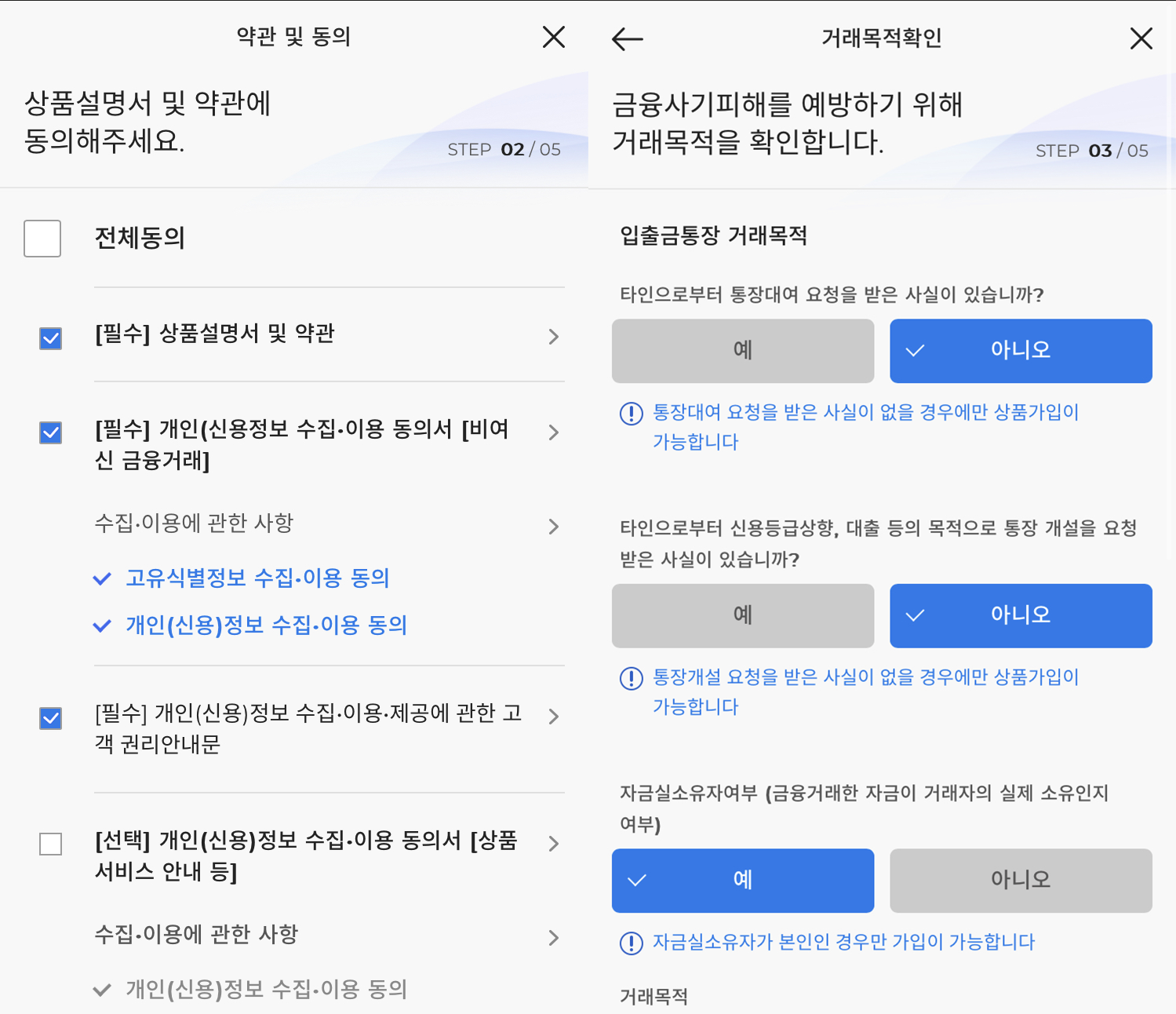 5. 상품설명서 및 이용약관에 동의 후 금융거래목적 확인