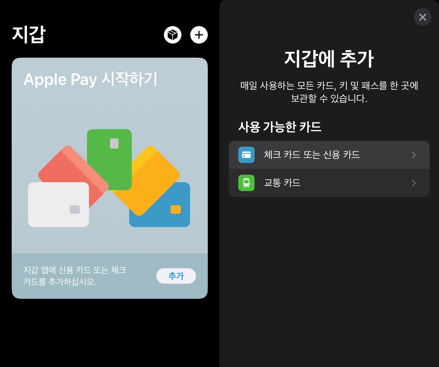 1. '지갑' 앱에서 [추가] - [체크 카드 또는 신용 카드]