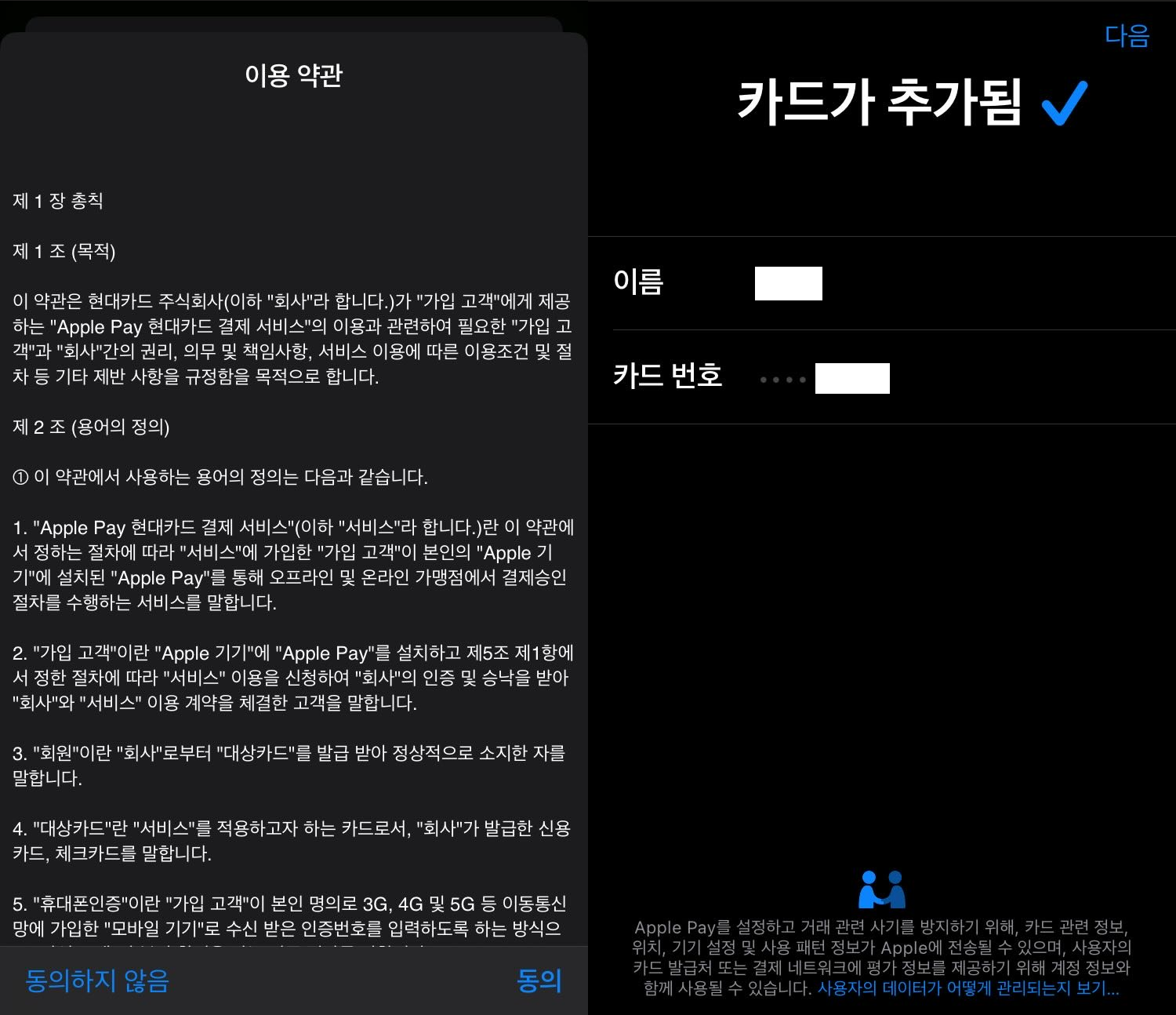 5. 결제 서비스 이용 약관에 동의 후 카드 추가 완료