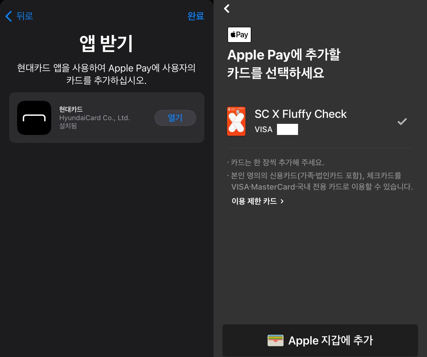 2. [열기] 링크를 타고 현대카드 앱 실행, 추가할 카드 선택 후 [Apple 지갑에 추가]