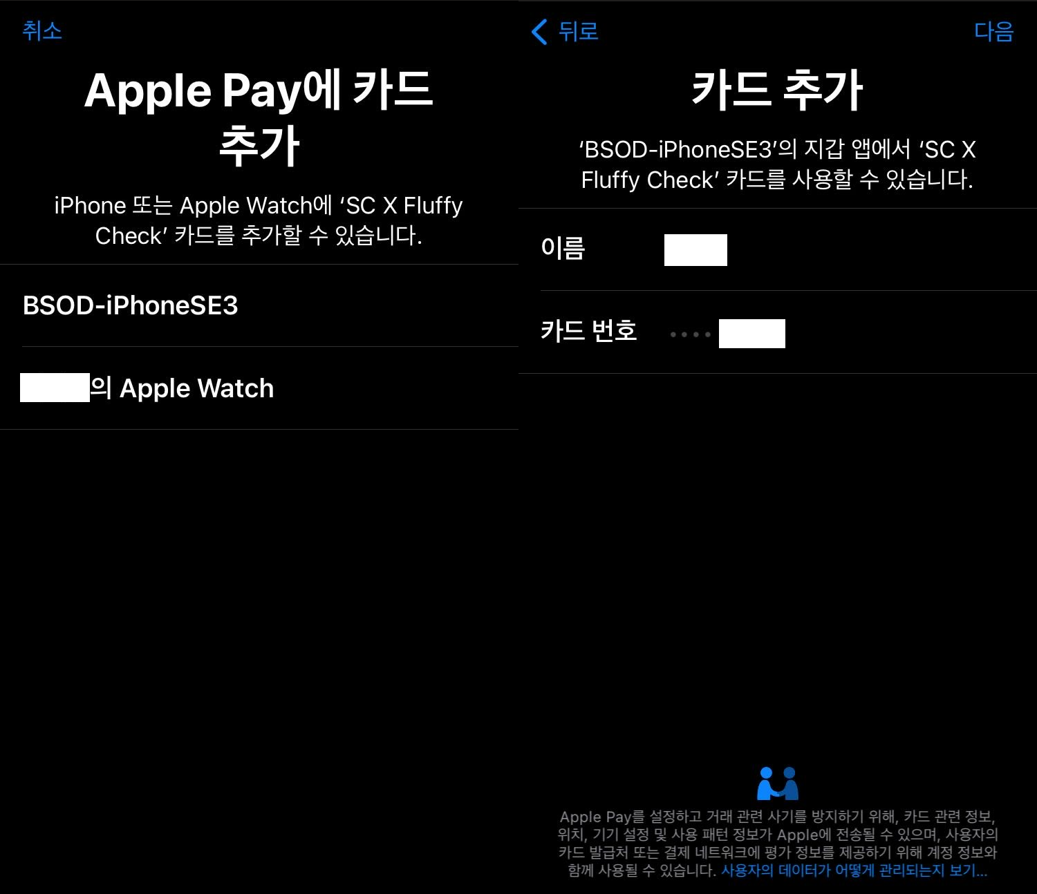 4. 애플 페이로 쓸 카드를 추가할 디바이스를 선택한 후 카드 추가 시도