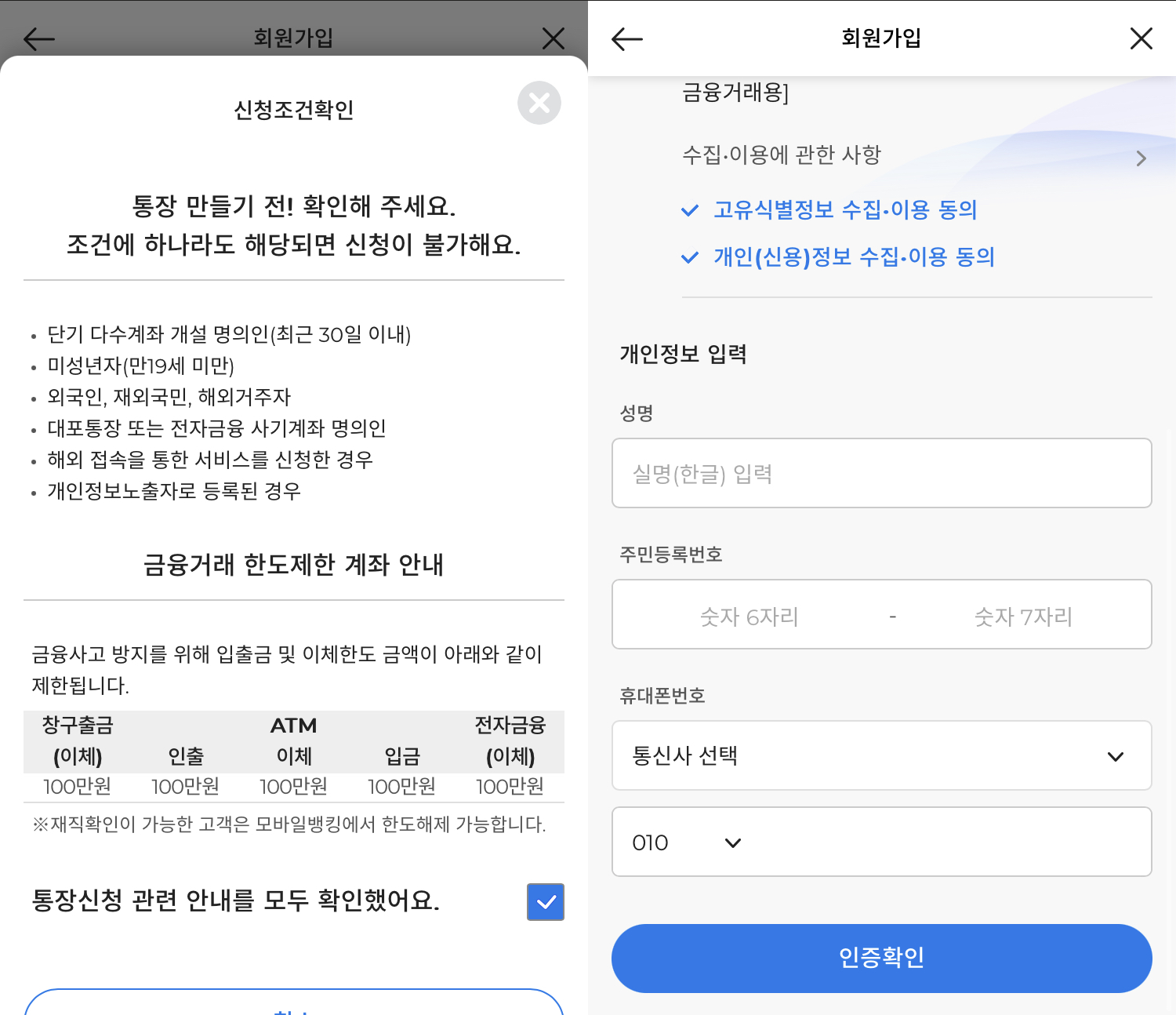 3. 계좌 개설 신청조건 확인 후 기본 개인정보를 입력하여 본인인증