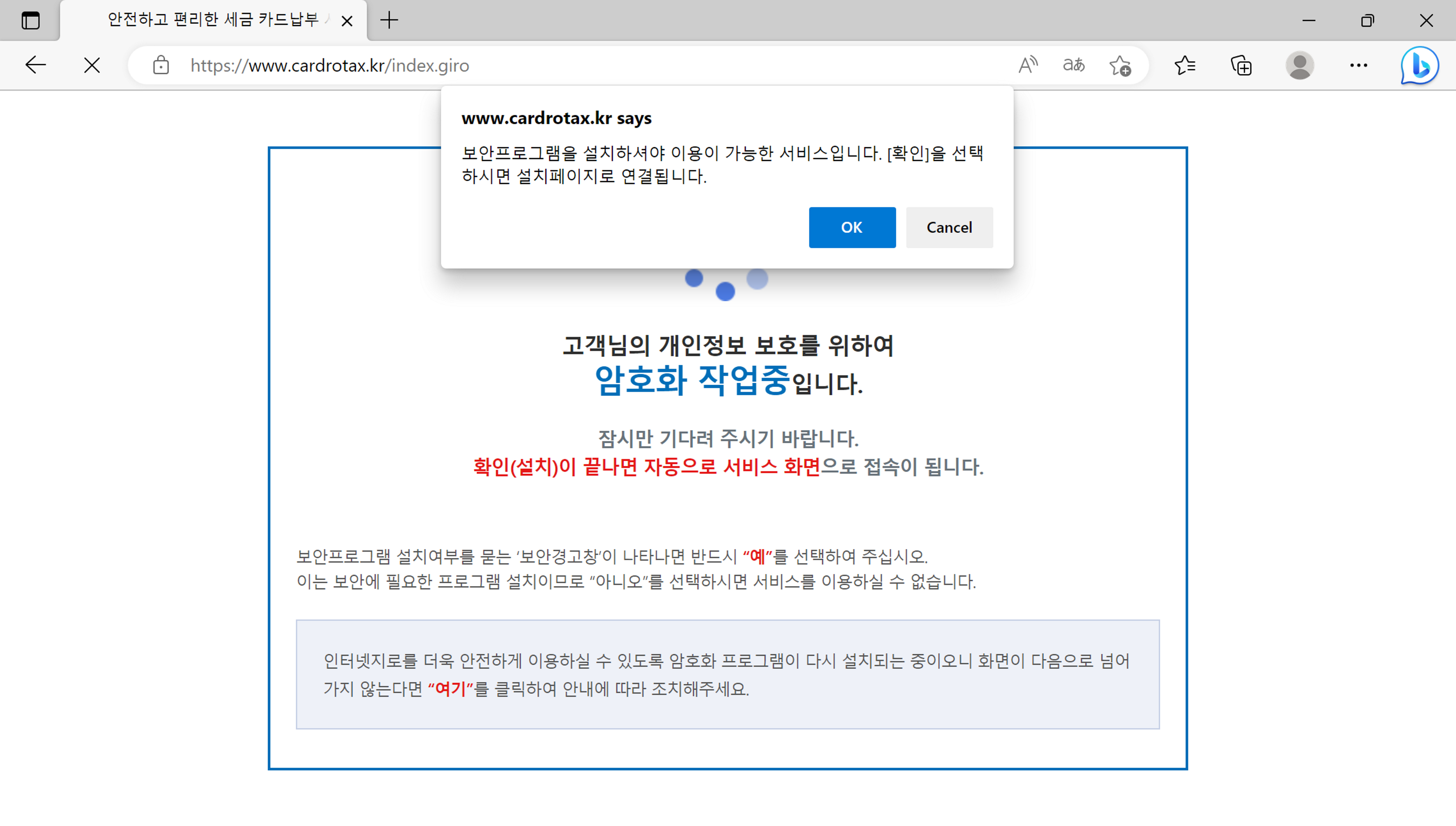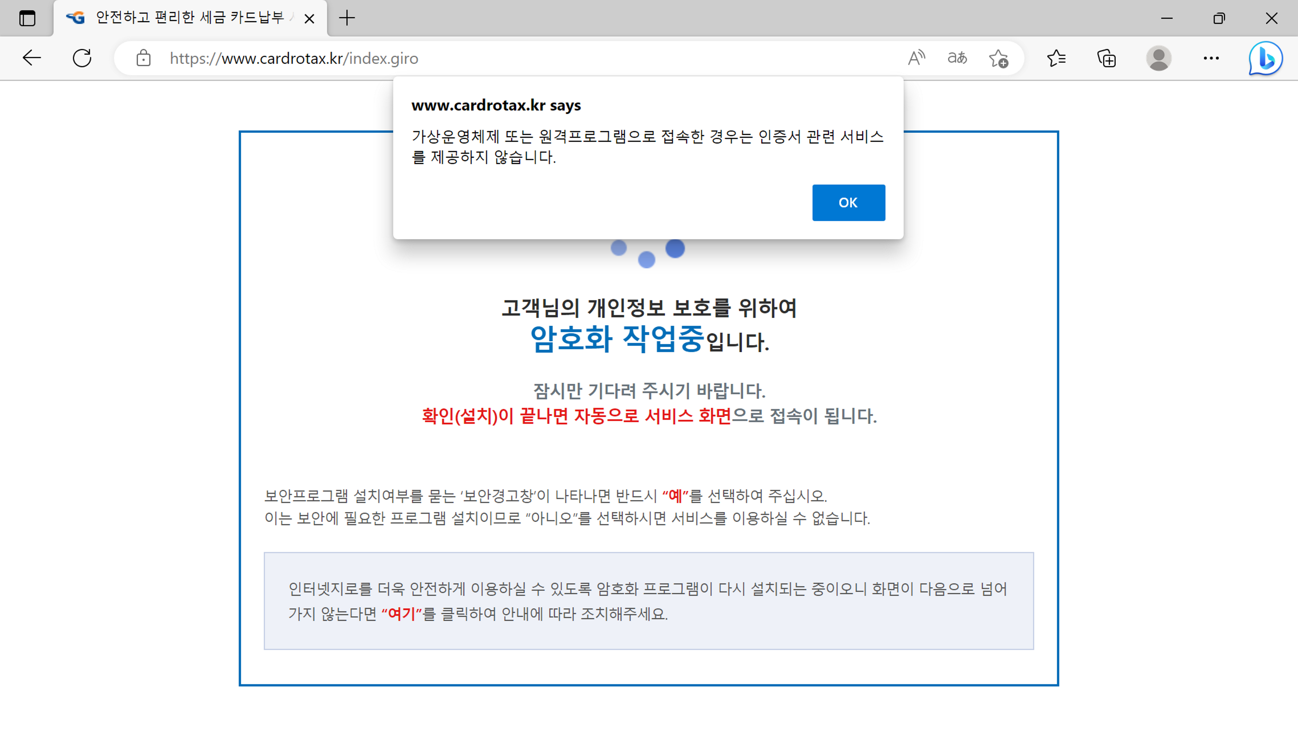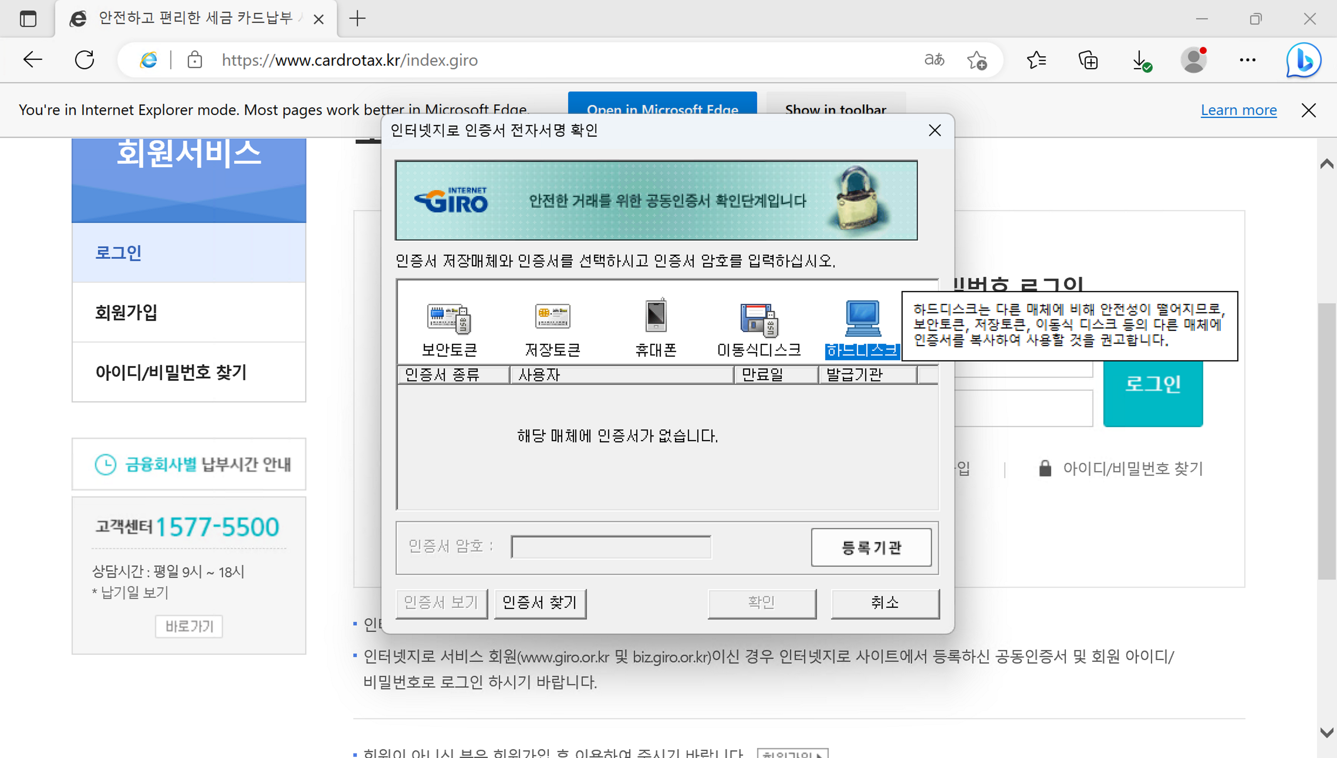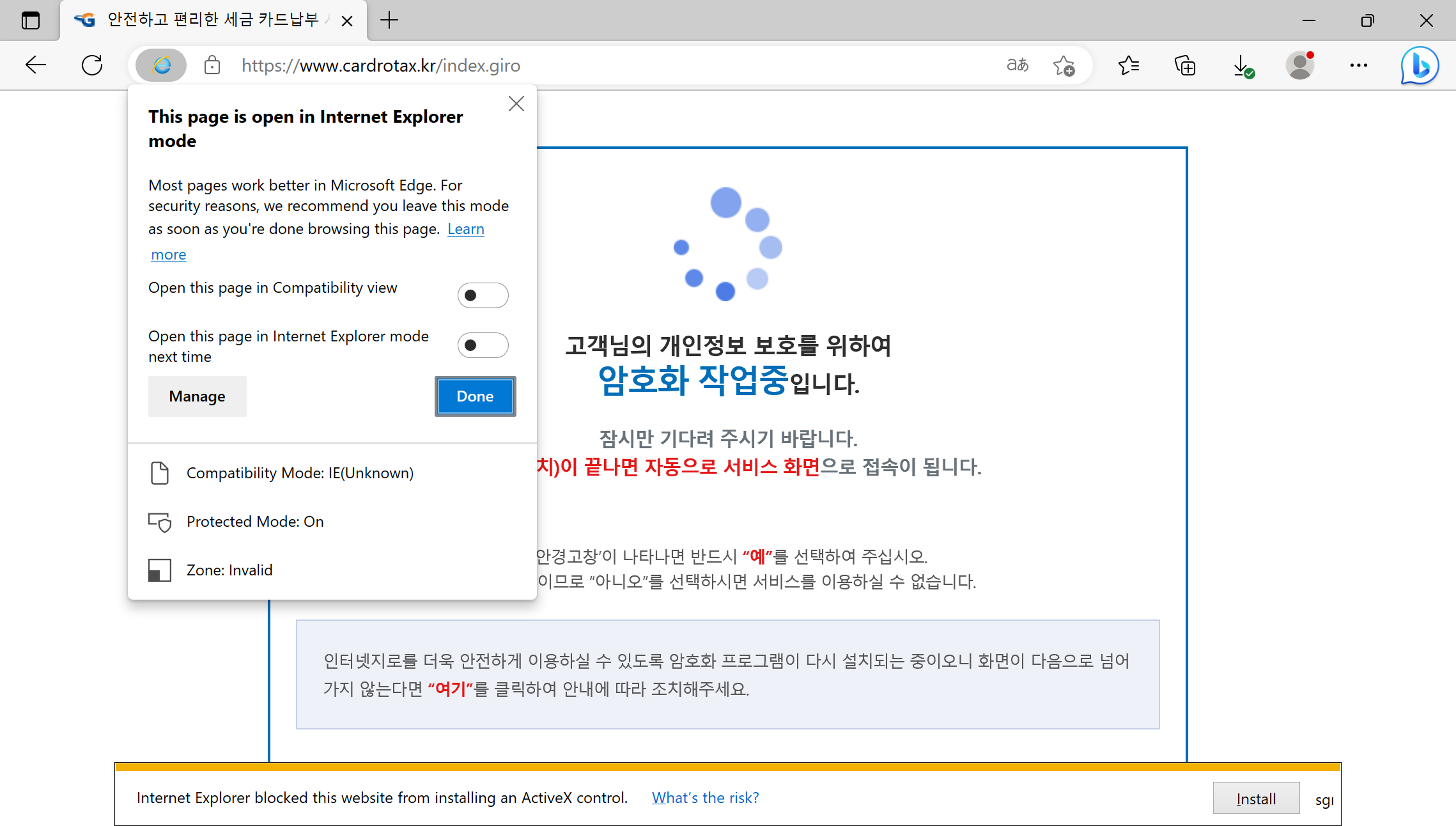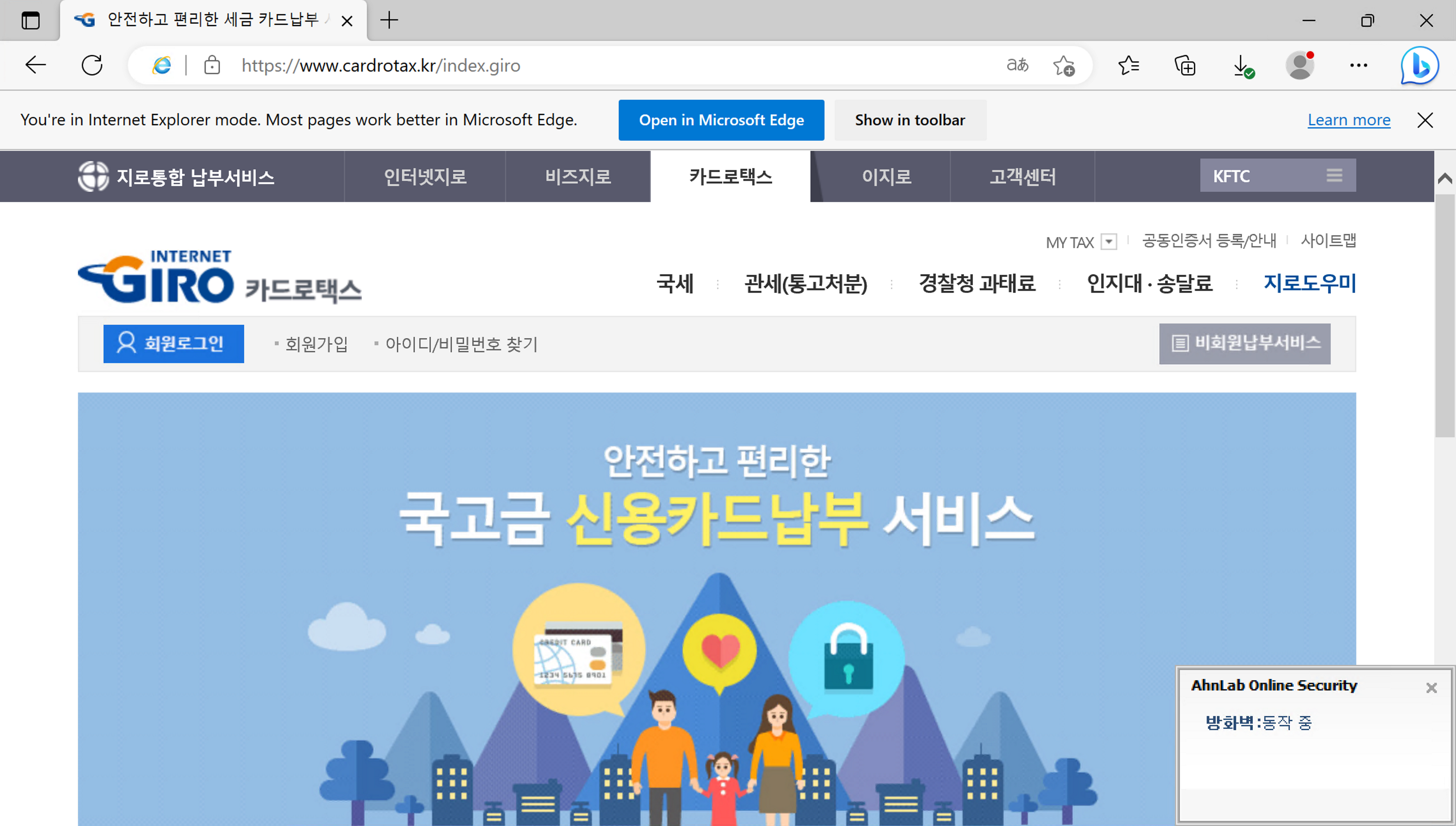 4. IE 모드로 웹 사이트에 접속하니 보안 프로그램이 정상적으로 구동되는 것을 볼 수 있다.