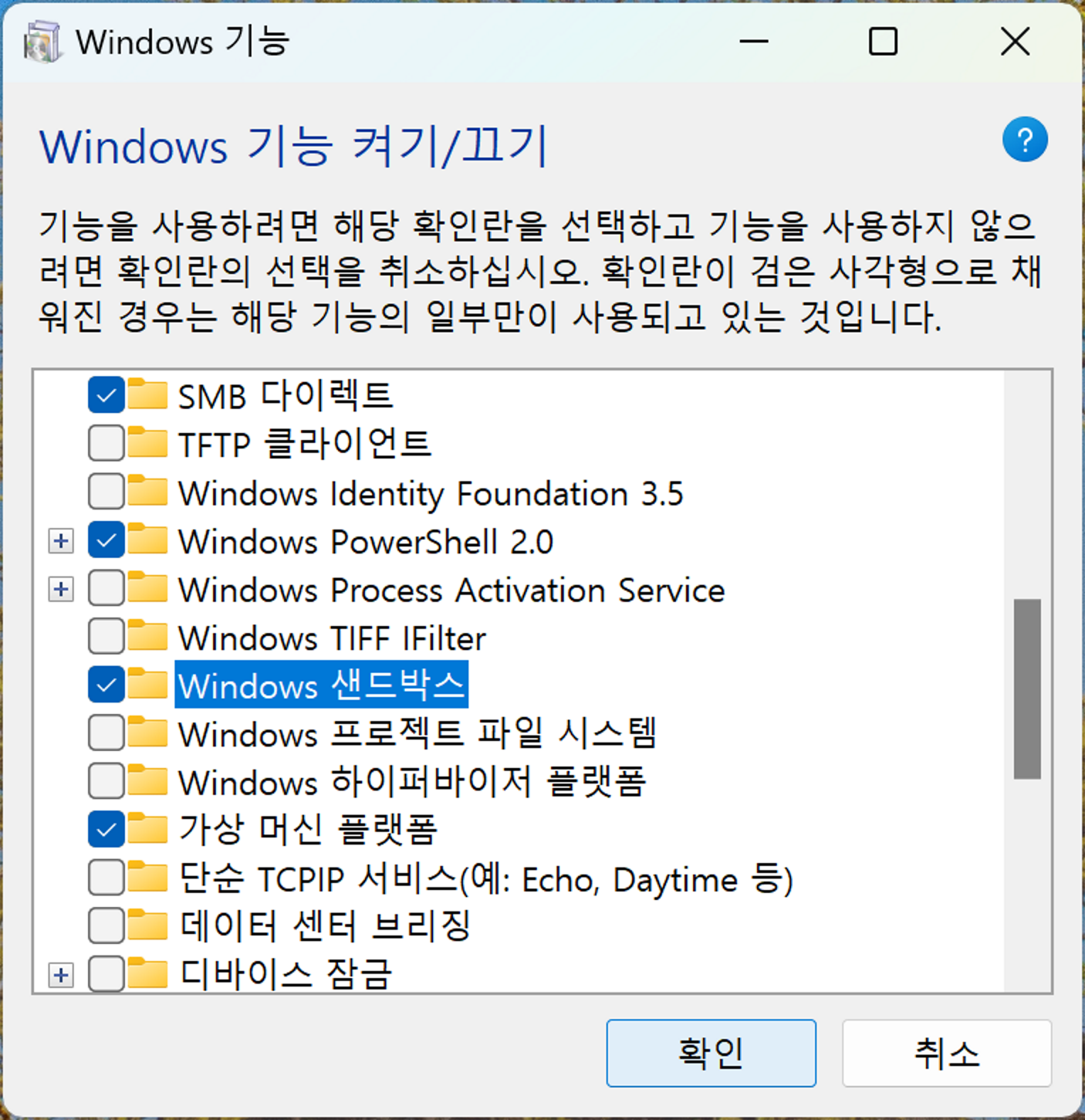2. 'Windows 샌드박스'에 체크 표시 후 [확인]