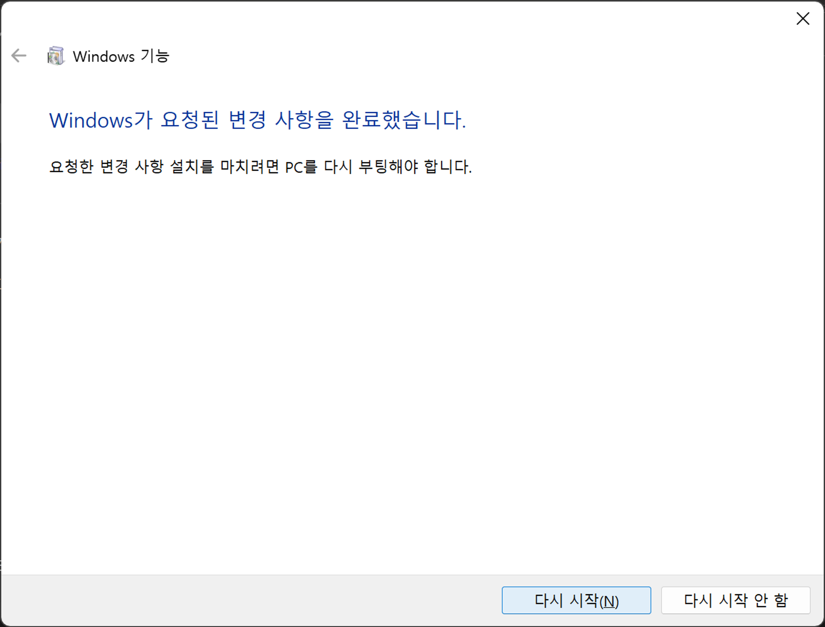 3. 기능 활성화 작업 진행. 요청된 변경 사항을 완료했다는 표시가 나오면 [다시 시작]