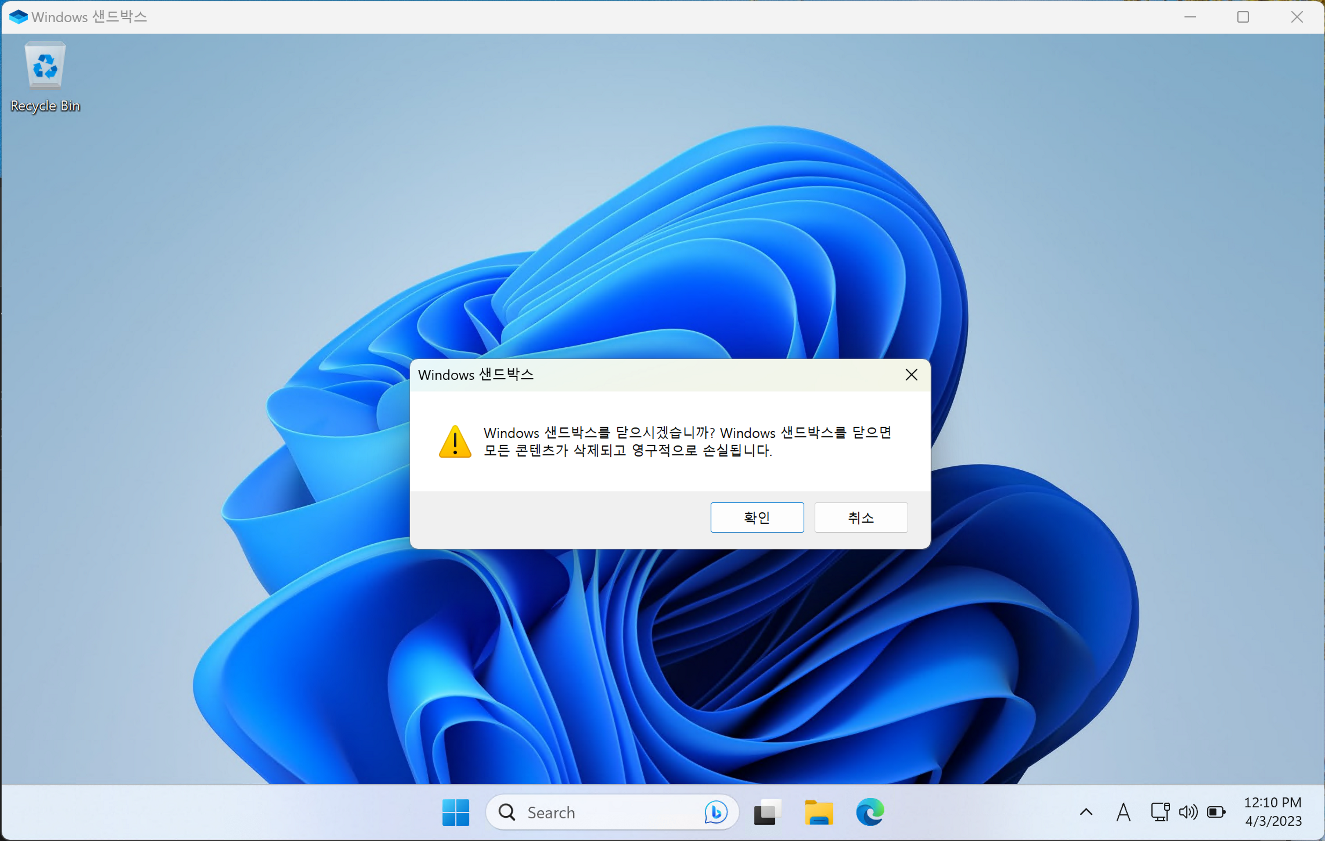 6. 프로그램 종료 시 사진과 같은 내용의 경고 메시지가 나온다. 창을 닫으면 가상 윈도우 안에서 행한 모든 작업 내용이 손실된다는 내용.