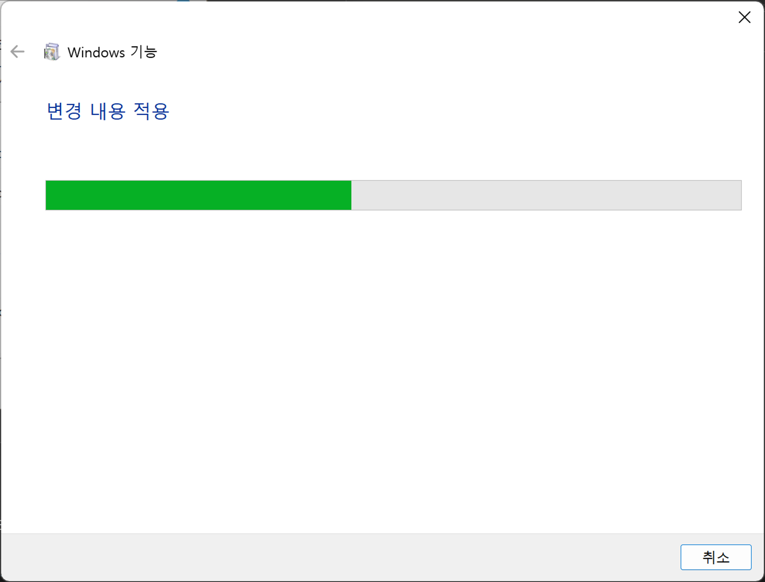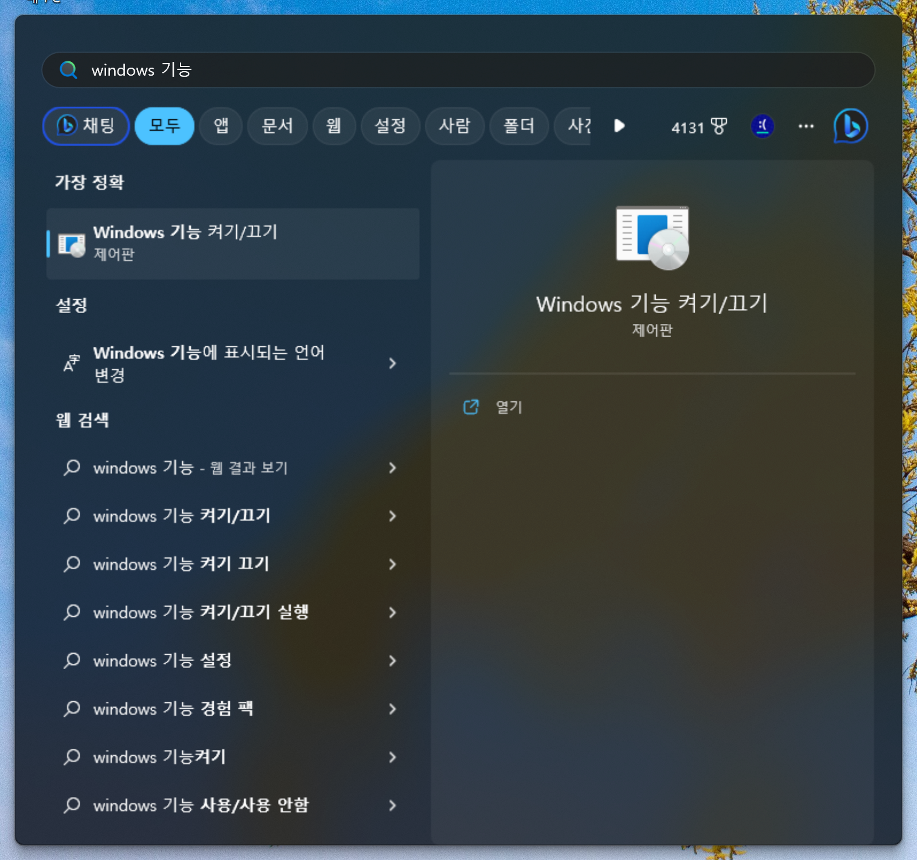 1. 시작 메뉴에서 'Windows 기능' 검색 후 'Windows 기능 켜기/끄기'라는 이름의 제어판 설정 항목 선택