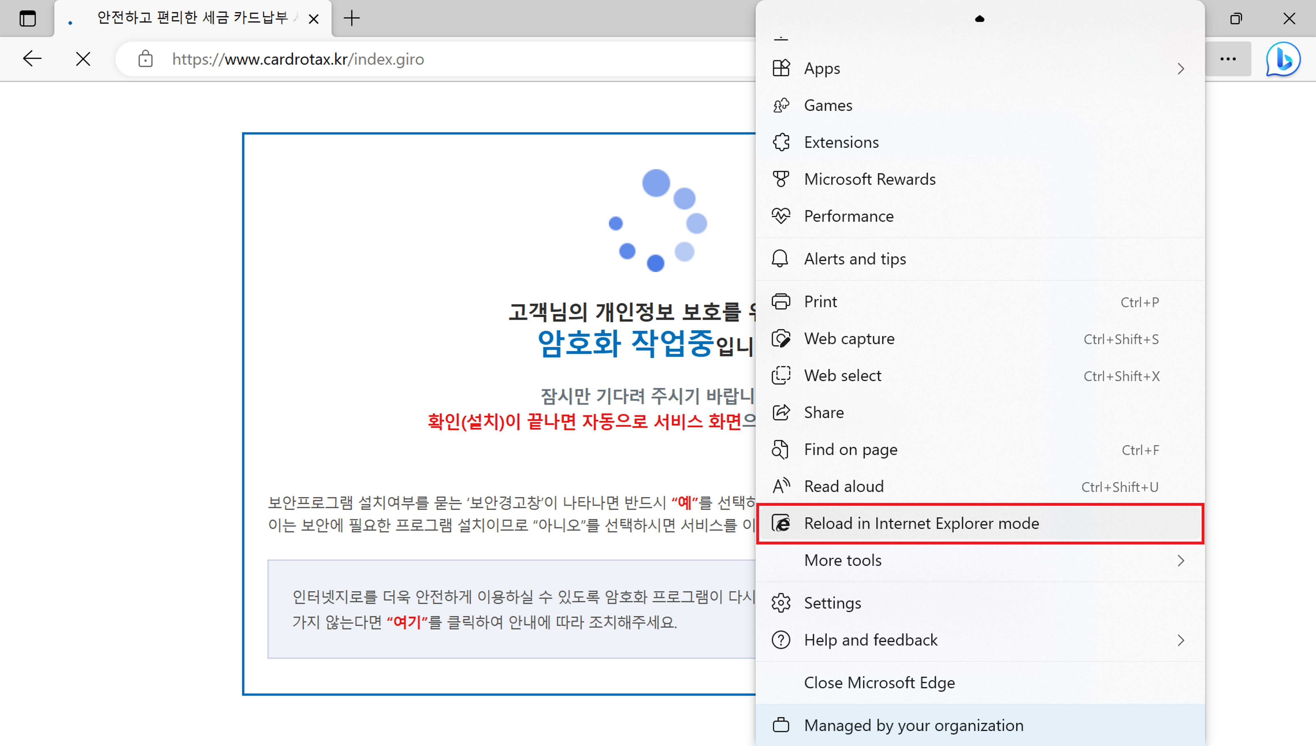2. 웹 브라우저 우상단의 […] 메뉴를 누른 뒤 [Internet Explorer 모드에서 다시 로드]