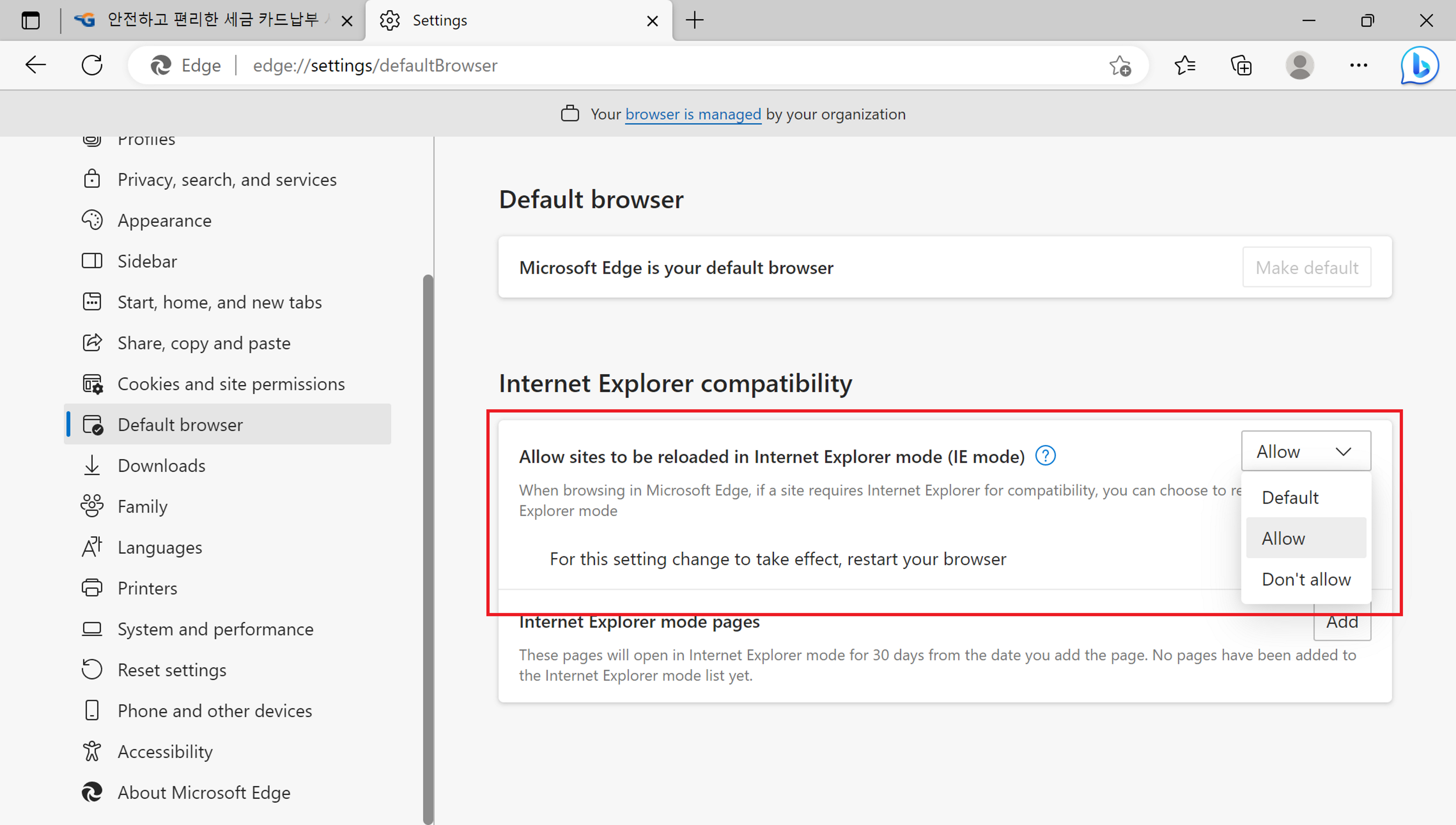 1. 설정의 [기본 브라우저] 섹션에 있는 'Internet Explorer 모드(IE 모드)에서 사이트를 다시 로드하도록 허용' 옵션을 '허용'으로 설정한다.