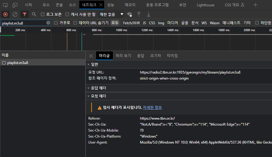 그렇기 때문에 대충 웹브라우저 개발자 도구의 '네트워크' 탭에서 'playlist.m3u8'이라는 이름으로 검출되는 항목만 잘 봐도 스트리밍 URL을 쉽게 얻을 수 있다.