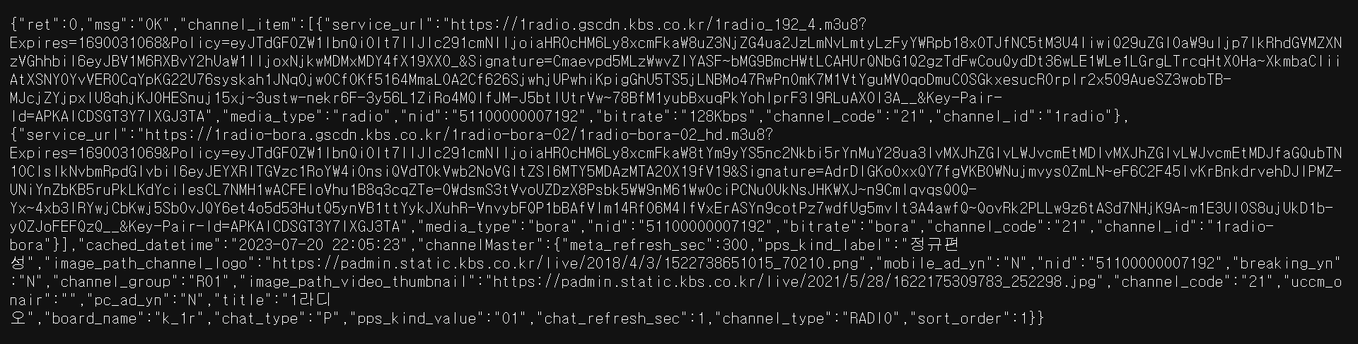 https://1radio.gscdn.kbs.co.kr/1radio_192_4.m3u8?Expires=1690031068&Policy=eyJTdGF0ZW1lbnQiOlt7IlJlc291cmNlIjoiaHR0cHM6Ly8xcmFkaW8uZ3NjZG4ua2JzLmNvLmtyLzFyYWRpb18xOTJfNC5tM3U4IiwiQ29uZGl0aW9uIjp7IkRhdGVMZXNzVGhhbiI6eyJBV1M6RXBvY2hUaW1lIjoxNjkwMDMxMDY4fX19XX0_&Signature=Cmaevpd5MLzWwvZIYASF~bMG9BmcHWtLCAHUrQNbG1Q2gzTdFwCouQydDt36wLE1WLe1LGrgLTrcqHtX0Ha~XkmbaCIiiAtXSNY0YvVER0CqYpKG22U76syskah1JNq0jw0CfOKf5164MmaL0A2Cf626SjwhjUPwhiKpigGhU5TS5jLNBMo47RwPnOmK7M1VtYguMV0qoDmuCOSGkxesucROrplr2x509AueSZ3wobTB-MJcjZYjpxlU8qhjKJ0HESnuj15xj~3ustw-nekr6F-3y56L1ZiRo4MQIfJM-J5btIUtrVw~78BfM1yubBxuqPkYohIprF3l9RLuAXOI3A__&Key-Pair-Id=APKAICDSGT3Y7IXGJ3TA