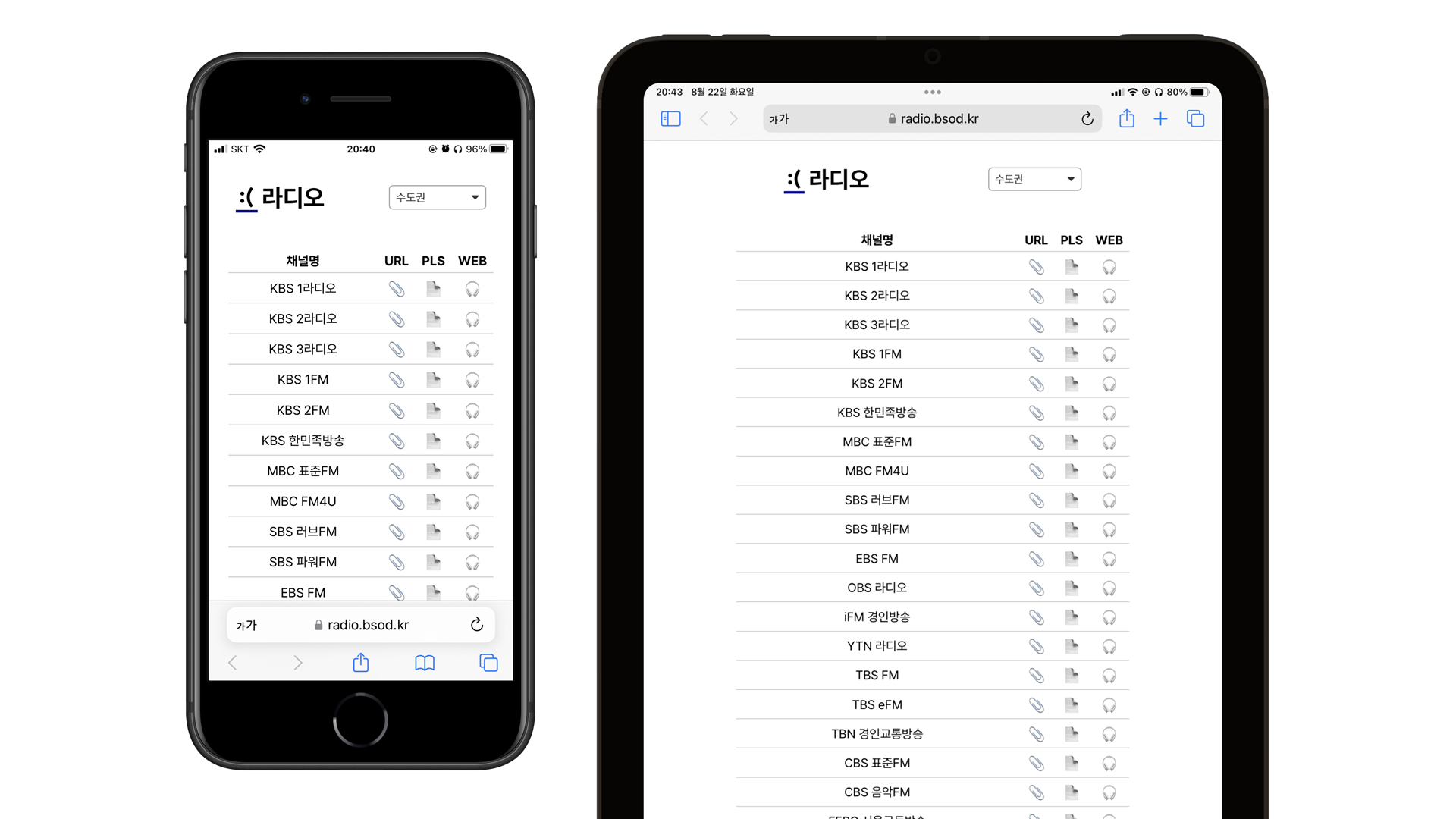 대한민국의 모든 라디오 방송국들에 대한 인터넷 스트림 URL을 엮은 웹페이지 (Cloudflare Workers에 구축한 서버리스 앱을 기반으로 작동) - GitHub - BSofDeath/webRadio: 대한민국의 모든 라디오 방송국들에