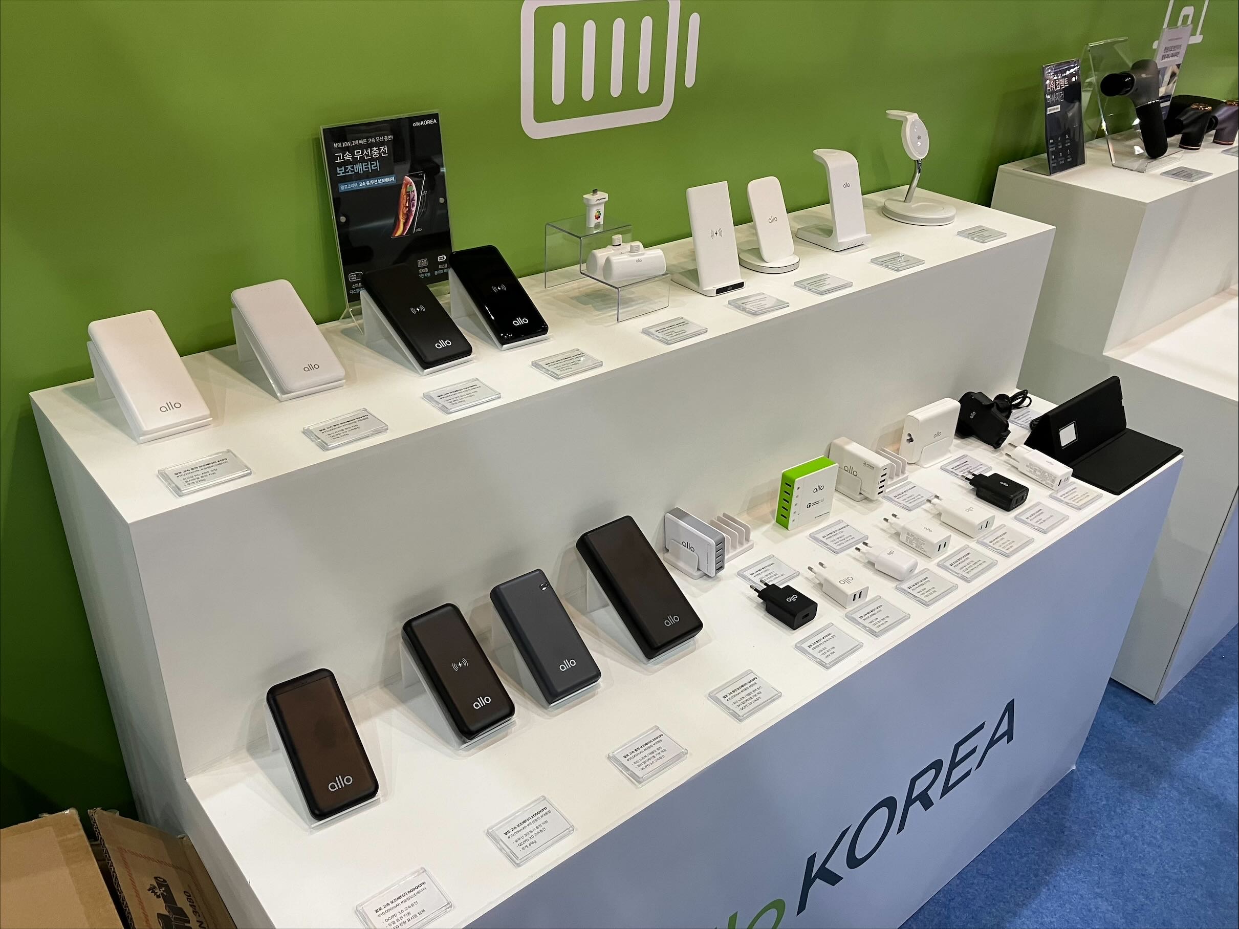 이를 증명하듯 알로코리아 부스에서는 현재 시판되고 있는 보조배터리와 충전 어댑터 상품들이 전시대 하나를 독차지하고 있는 모습을 볼 수 있었다.