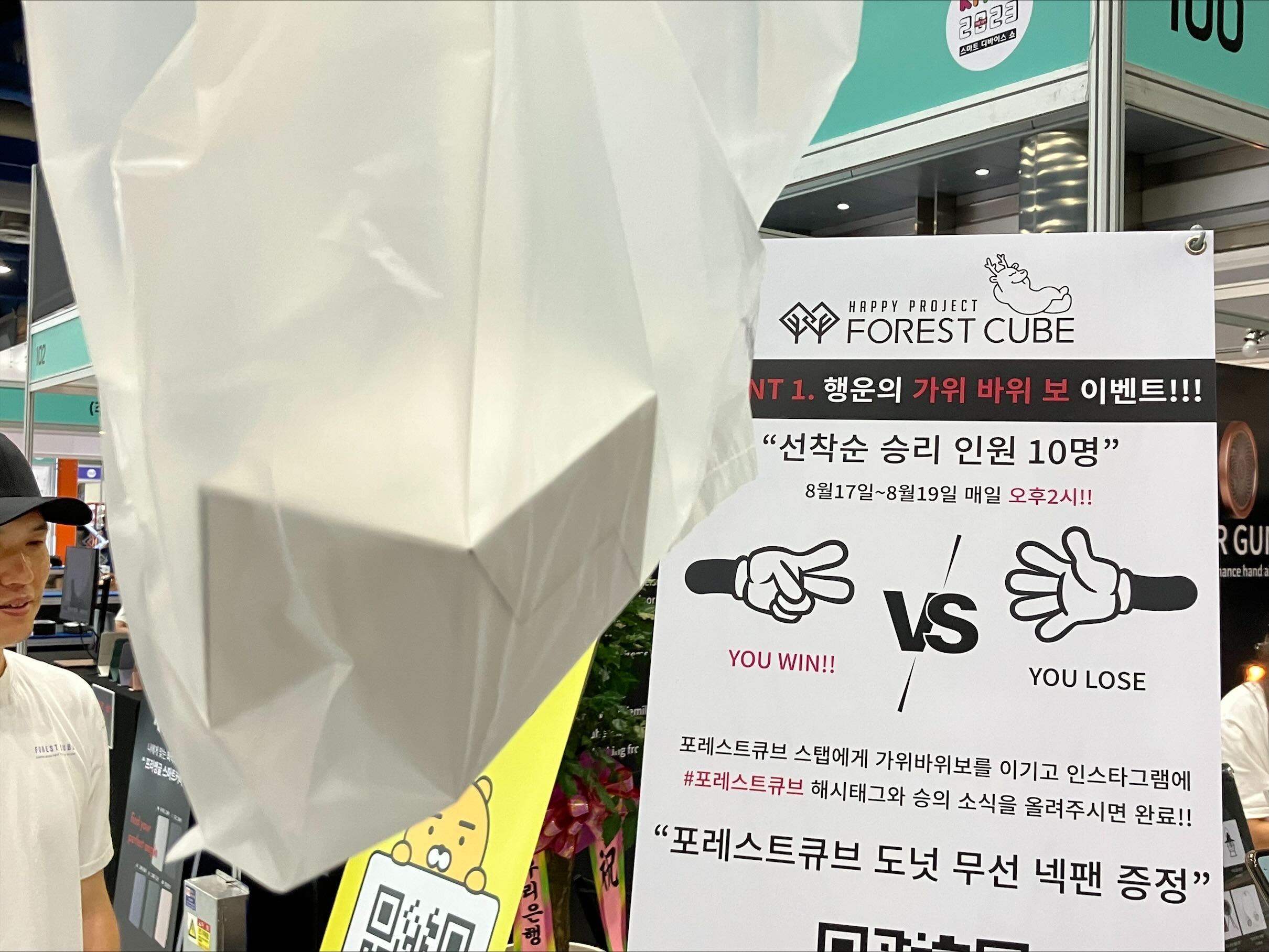 당시 이 부스에서는 선착순 가위바위보 이벤트에서 승리를 쟁취한 10명에게 '도넛 무선 넥팬'을 무료로 증정하기도 했다. 여담으로 나도 그 중 한 명이었다 히히.