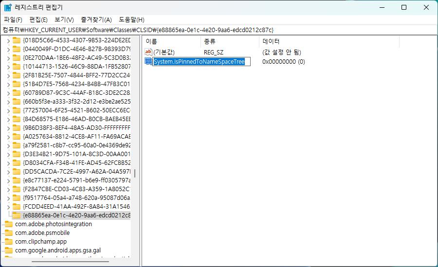 2. 해당 키 내부에 이름이 System.IsPinnedToNameSpaceTree인 DWORD(32비트) 값을 새로 만든다. 값을 별도로 수정할 필요는 없다.