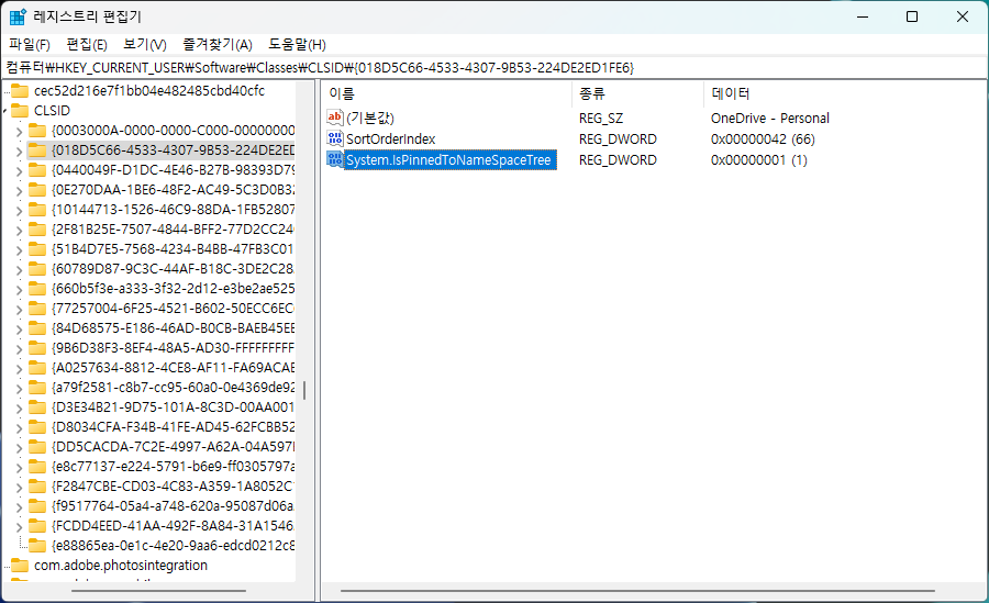 키 {018D5C66-4533-4307-9B53-224DE2ED1FE6}를 찾아 System.IsPinnedToNameSpaceTree 값을 1에서 0으로 수정한다.