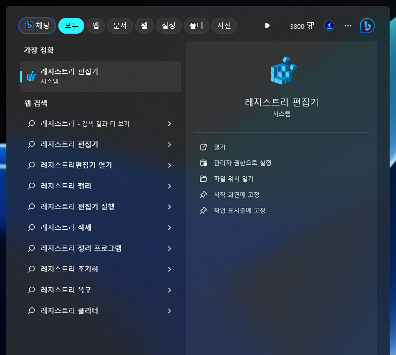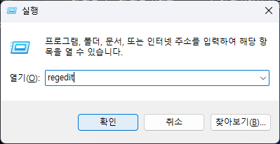 1. 실행 창(Win+R)에서 'regedit'을 입력하거나, 검색 메뉴에서 '레지스트리'를 입력하여 [레지스트리 편집기]를 실행한다.