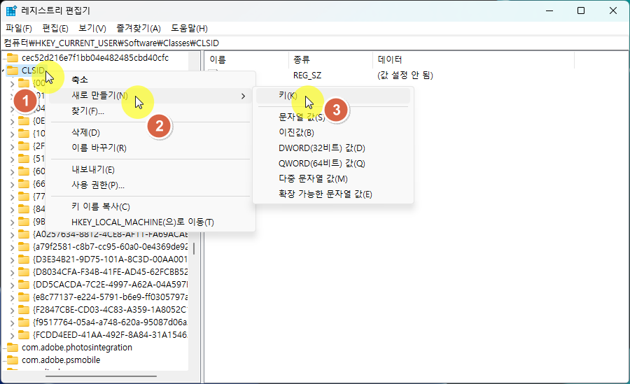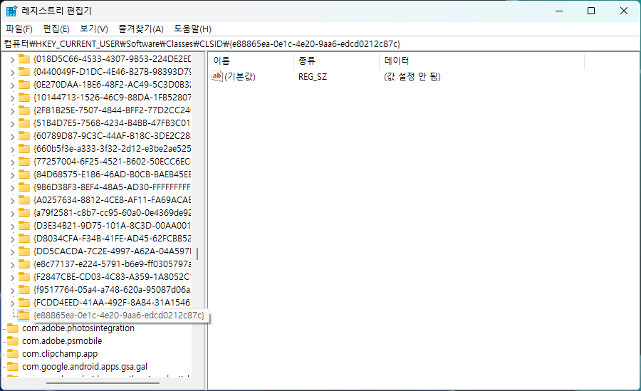1. CLSID\ 경로에 키 {e88865ea-0e1c-4e20-9aa6-edcd0212c87c}를 새로 만든다.