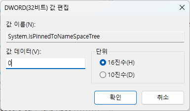 2. 해당 키 내부에 이름이 System.IsPinnedToNameSpaceTree인 DWORD(32비트) 값을 새로 만든다. 값을 별도로 수정할 필요는 없다.
