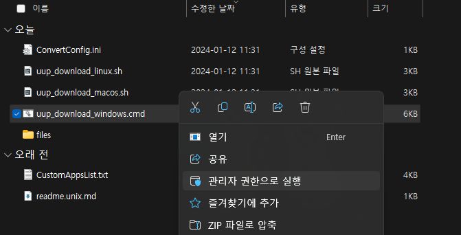 8. 압축 파일을 풀었던 경로 내에서 'uup_download_windows.cmd' 파일을 관리자 권한으로 실행