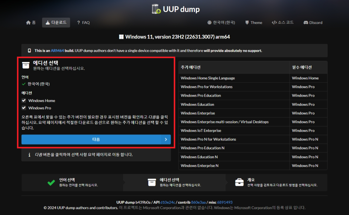 2. '빠른 옵션' 섹션에서 원하는 출시 타입을 찾고 [arm64]를 클릭