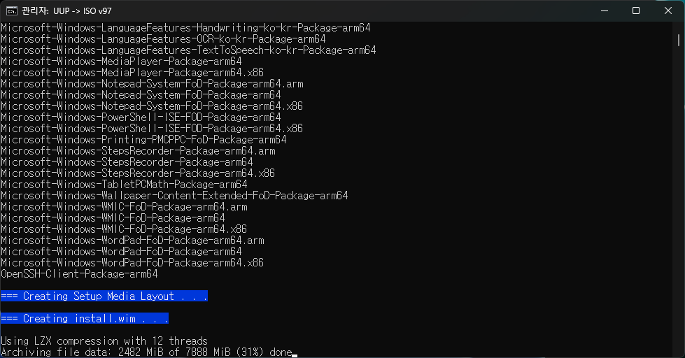 9. 작업이 자동으로 진행됨 (윈도우 업데이트 서버에서 설치 패키지를 다운받고 ISO 파일로 변환하는 과정)