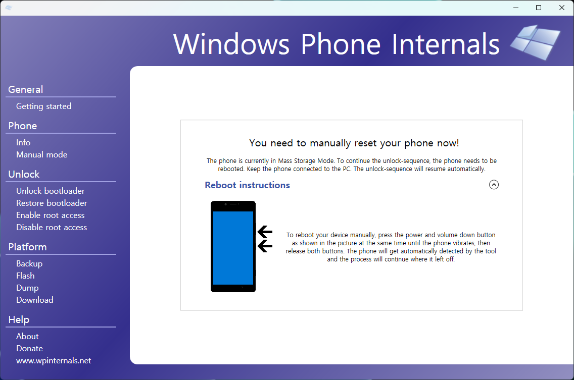 부트로더 언락 작업은 part 1과 part 2로 나뉘는데, part 1이 끝난 후 루미아폰을 수동으로 재부팅시켜야 하는 구간이 있다.