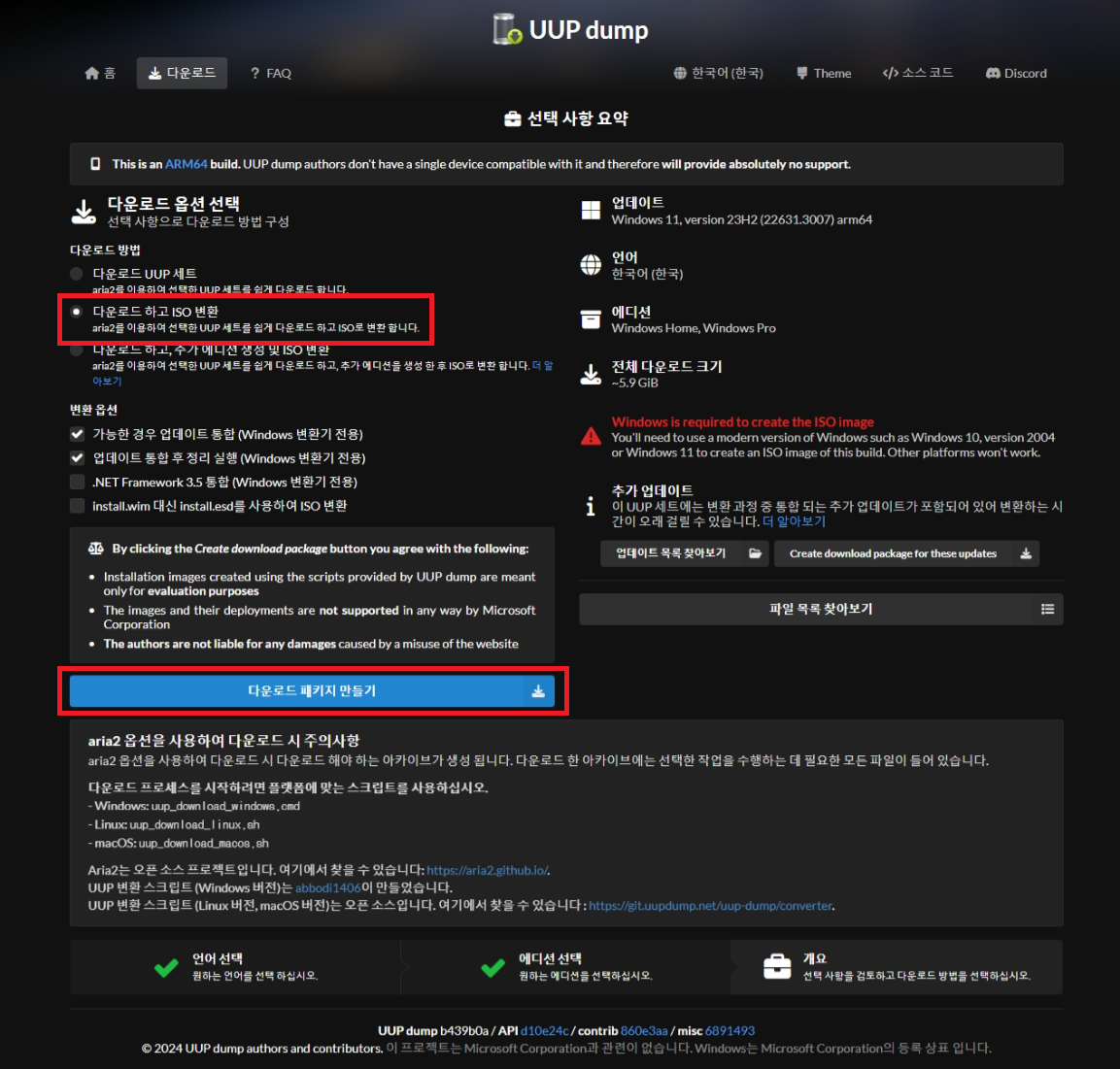 6. 다운로드 옵션을 '다운로드 하고 ISO 변환'으로 설정 후 [다운로드 패키지 만들기]