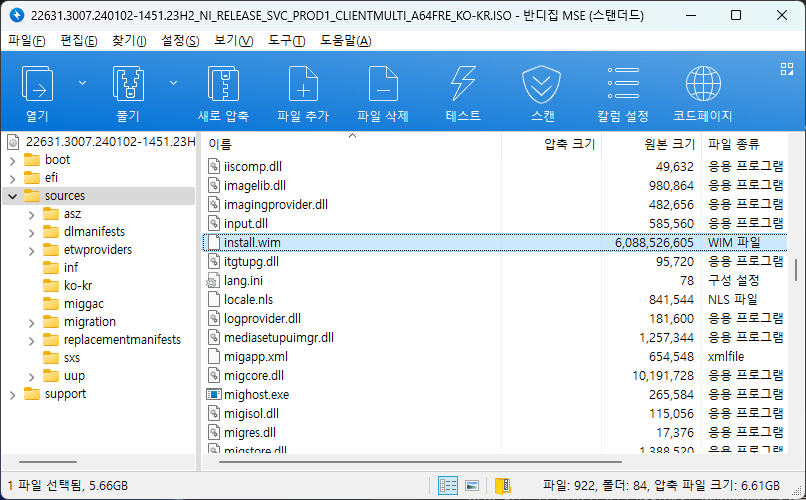 10. 작업 완료 후 생성된 ISO 파일에서 'install.wim' 파일 추출