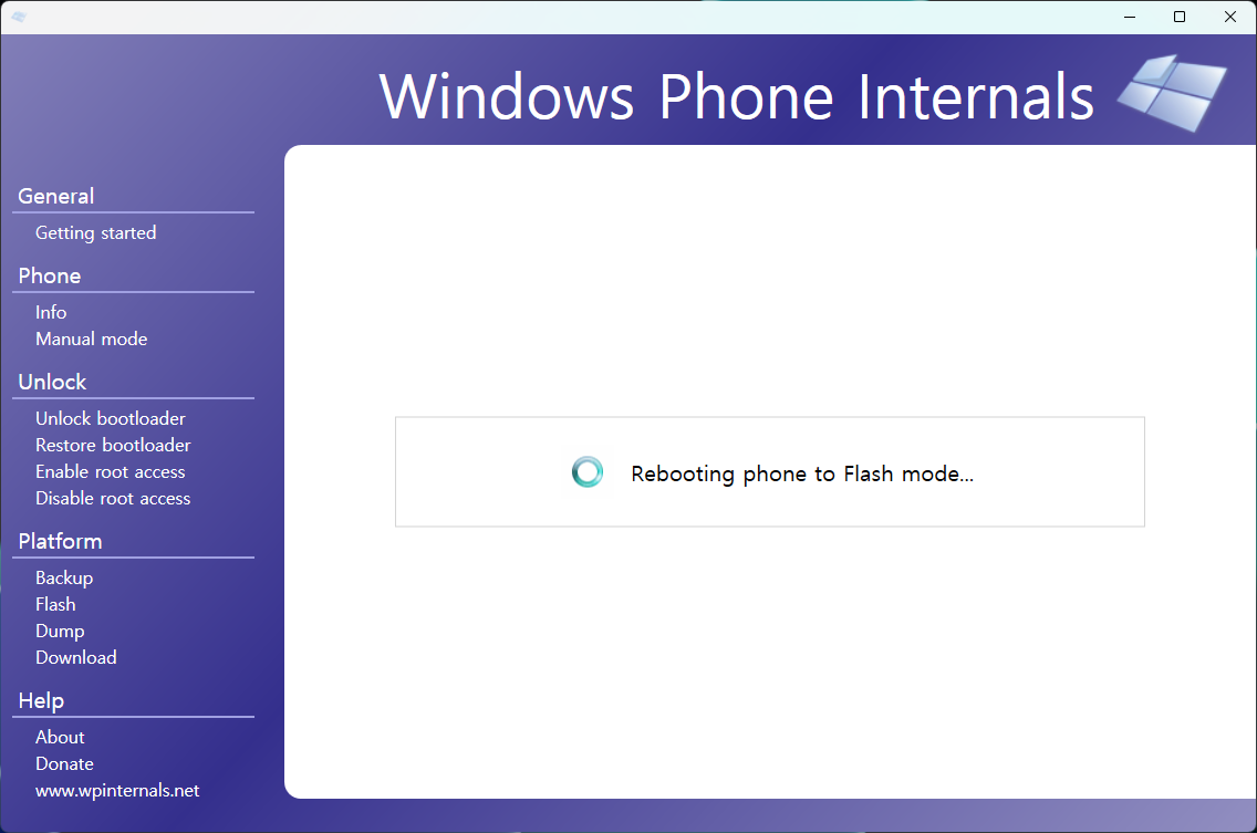 4. PC와 연결된 루미아폰이 Flash mode로 재부팅된다.
