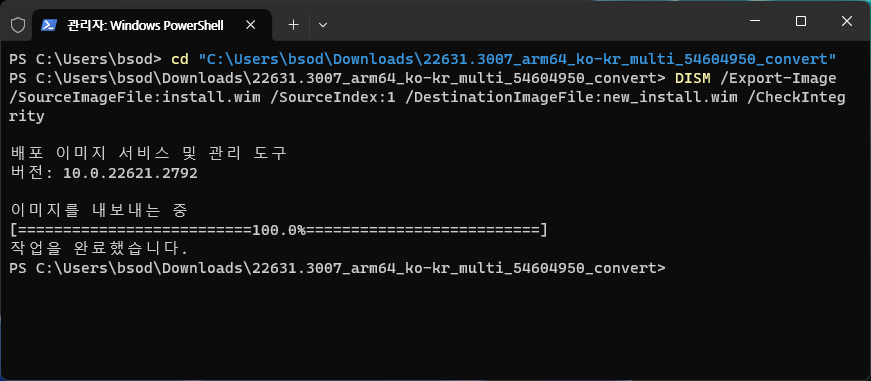 11. 'install.wim' 파일이 있는 경로에서 관리자 권한으로 PowerShell을 켠 뒤 아래의 명령 실행.