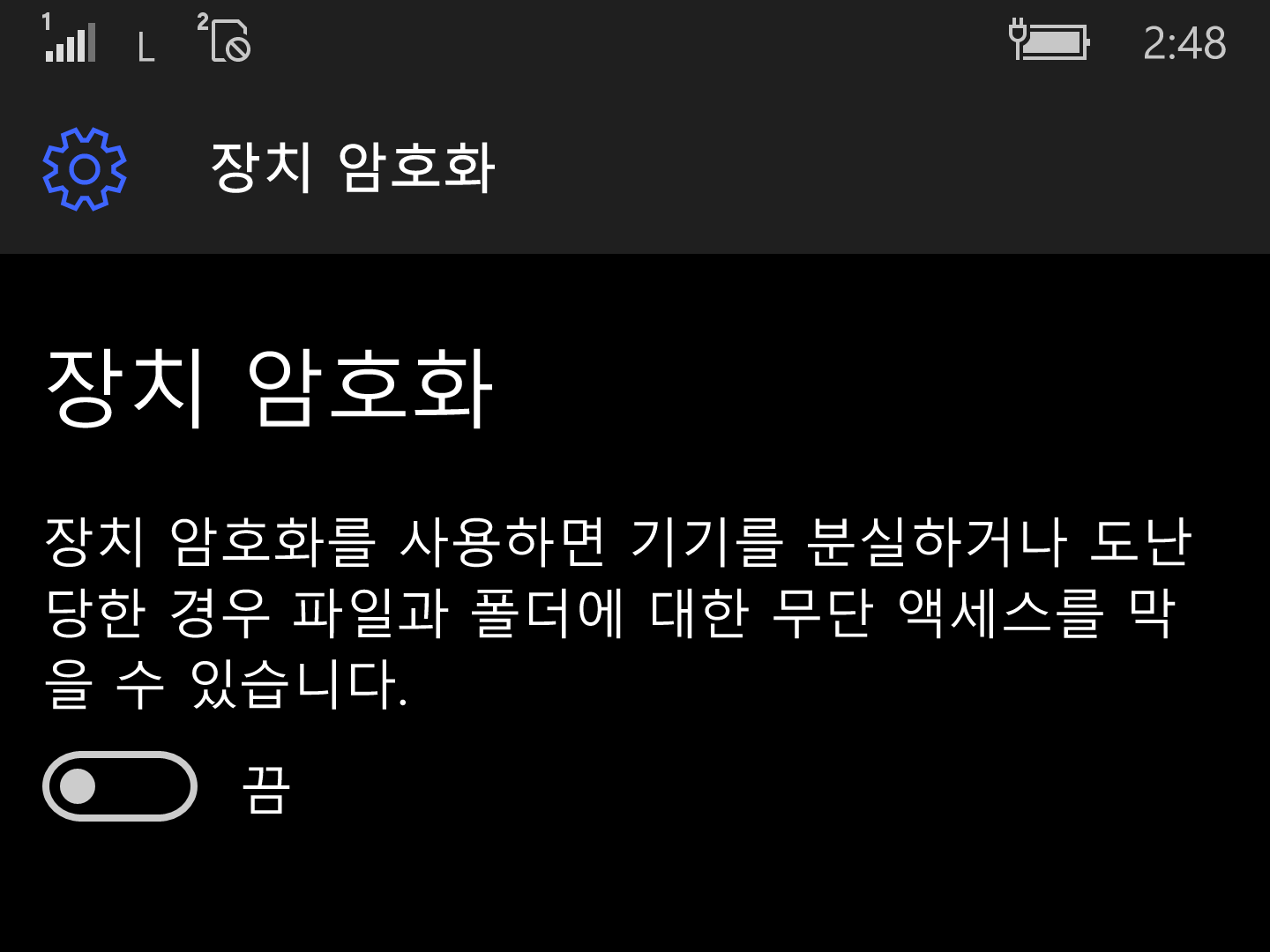 0. 루미아폰에서 '설정'에 들어가 '장치 암호화' 기능이 해제되어 있는지 확인 (시스템 > 장치 암호화)