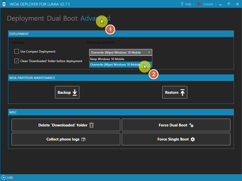 4. 'Advanced' 탭으로 들어가 'SPACE ALLOCATION' 설정을 [Overwrite (Wipe) Windows 10 Mobile]로 변경.