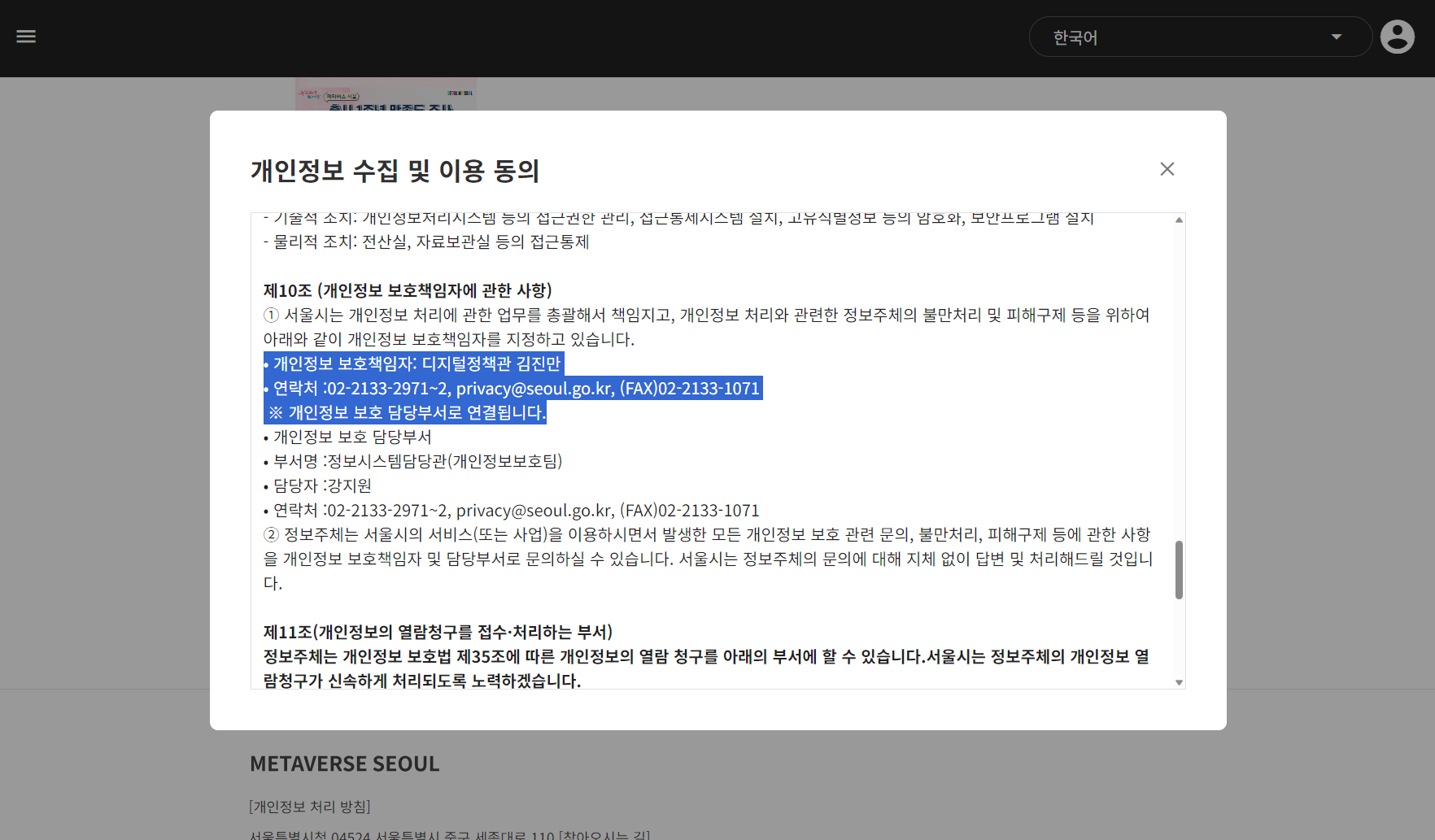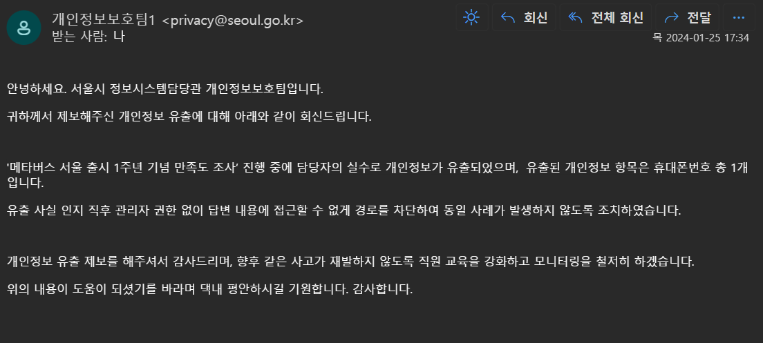 서울시 정책에 관심을 가지고 이용해주시는 시민분들께 사과의 말씀을 드립니다. ‘메타버스 서울 출시 1주년 기념 만족도 조사’ 진행 중에 담당자의 실수로 귀하의 소중한 개인정보가 유출되었음을 알려 드리며, 이에 대하여 진심으로 사과를 드립니다.