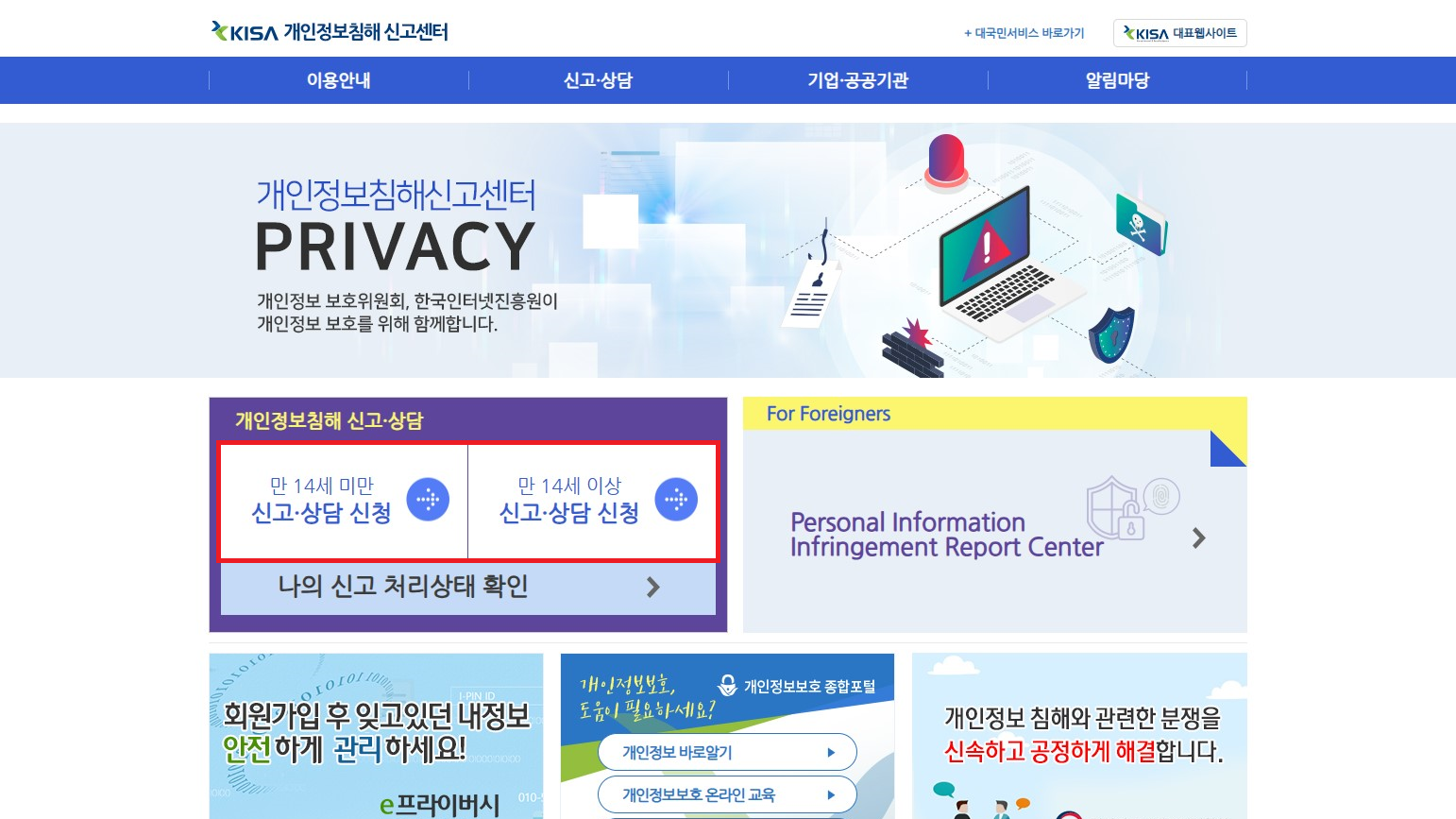 1. 'KISA 개인정보침해 신고센터' 홈페이지에 접속한다.