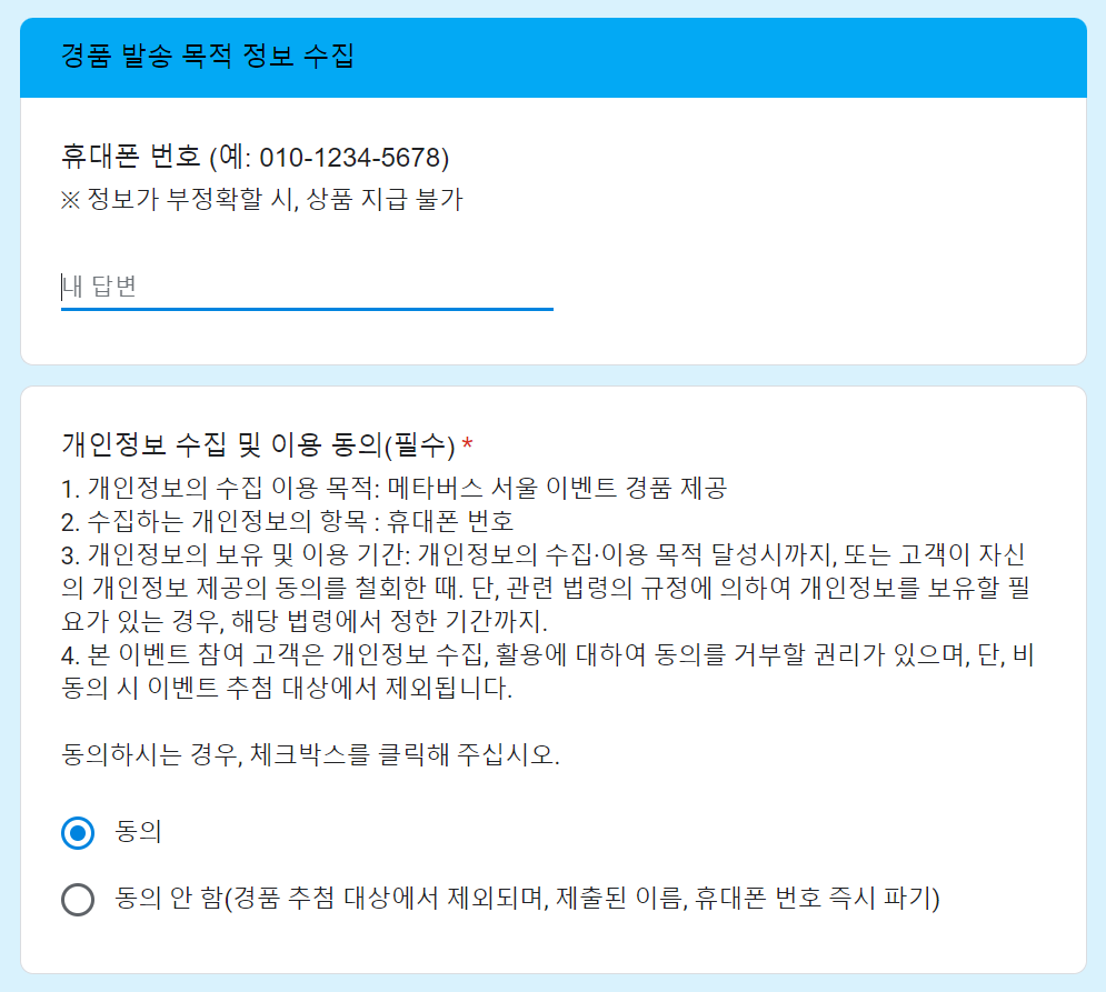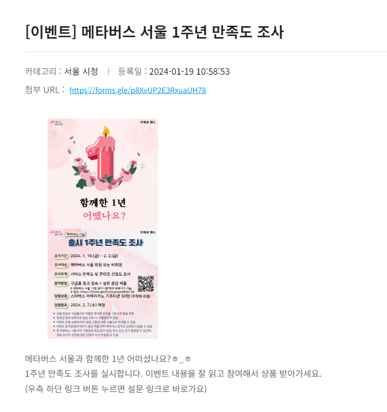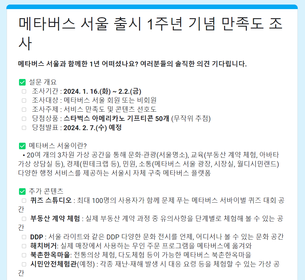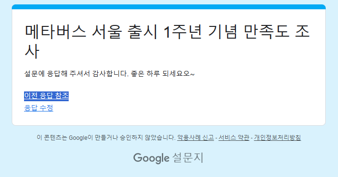 얼마 전에 서울시청에서 주관하는 한 설문 이벤트에 참여한 적이 있다. '메타버스 서울' 서비스에 대한 만족도 조사였는데, 구글 폼을 활용해 진행된 이벤트였다.