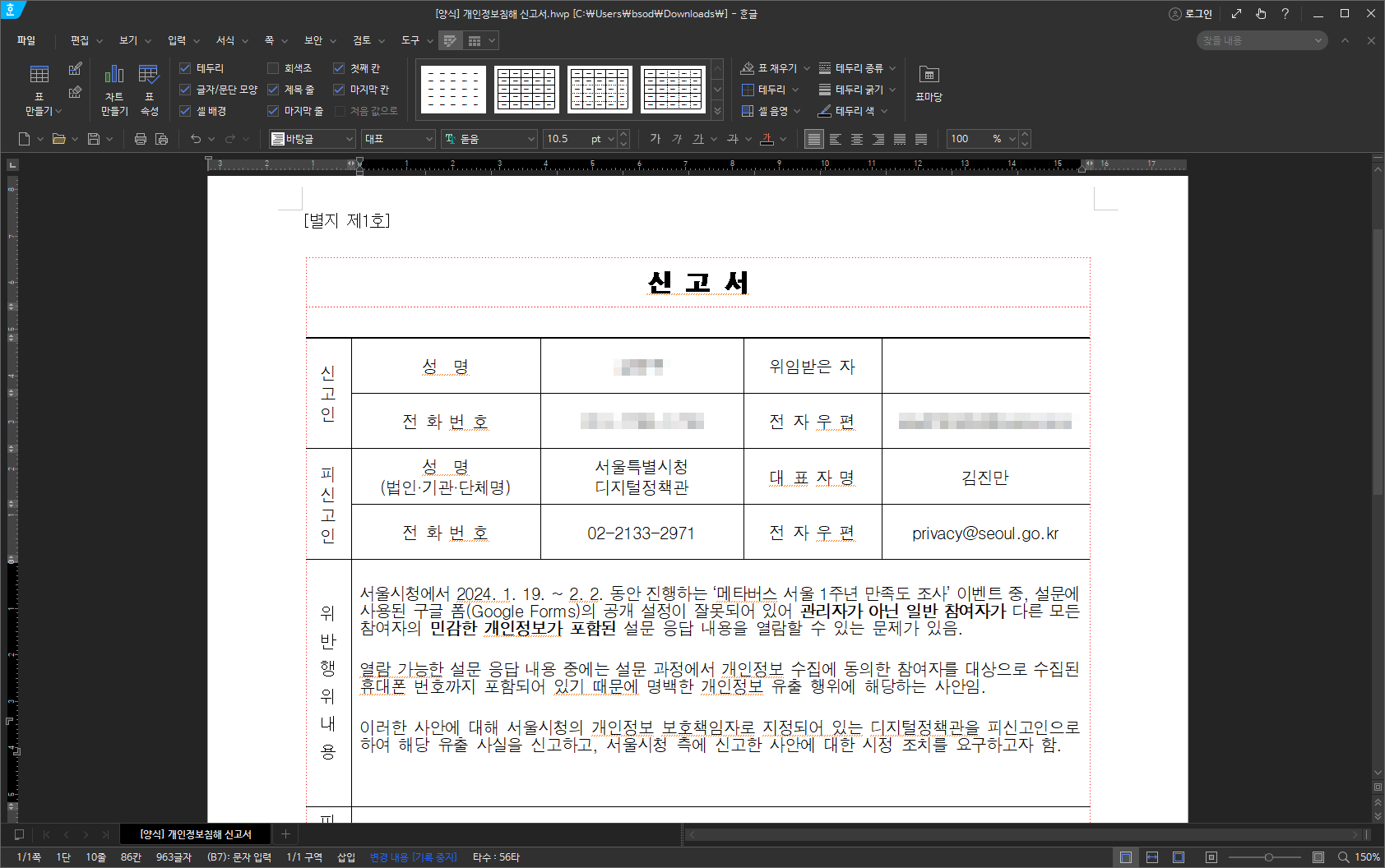 ㅇ 피해 등 접수 e-메일주소 : privacy@seoul.go.kr