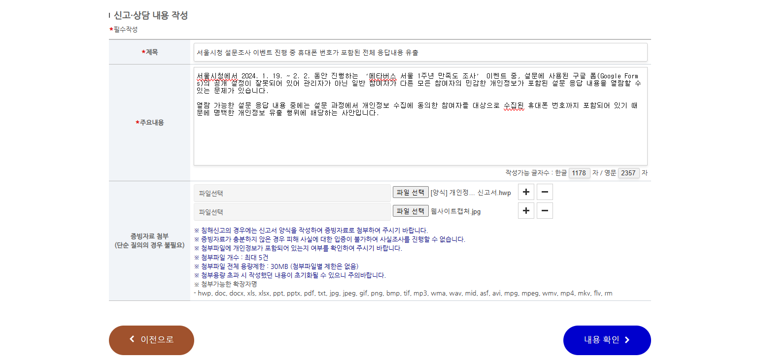 주요 내용 란에는 신고서에 작성한 내용을 간략히 요약한 것을 적고, 증빙자료 첨부 란에는 작성한 신고서와 기타 증거용 자료를 첨부한다.
