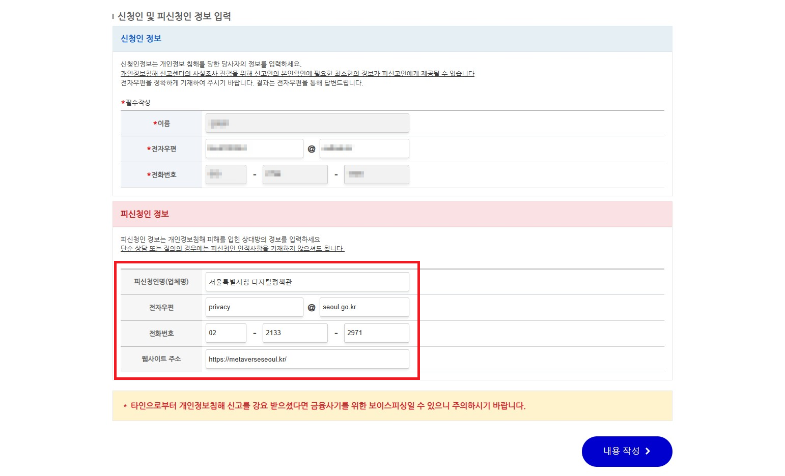 피신청인 정보에는 보통 개인정보가 유출된 기관의 개인정보 보호책임자 인적사항을 기입하면 된다.