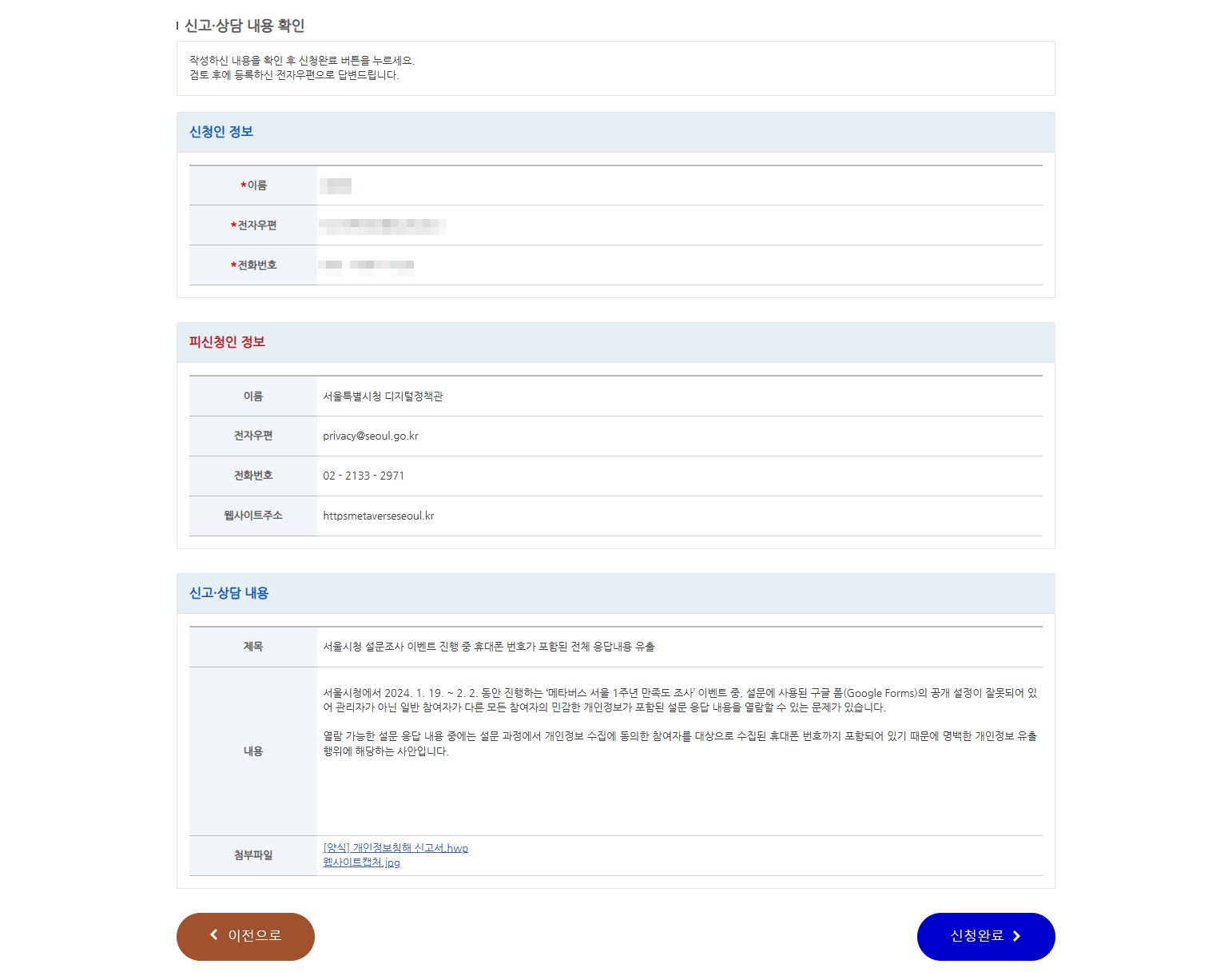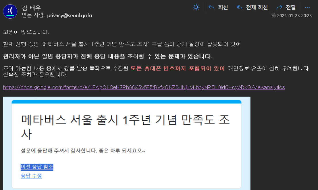 유출 사실 인지 직후 관리자 권한 없이 답변 내용에 접근할 수 없게 경로를 차단하였습니다. 혹시 모를 피해를 최소화하기 위하여 모르는 번호로 전화를 수신받거나, 서울시를 사칭하여 이벤트 당첨을 안내하는 연락에 주의를 부탁드립니다. 만족도 조사 이벤트의 결과는 메타버스 서울 공식 인스타그램에 게시할 예정이며, 당첨자에게는 추가 정보 요청 없이 경품이 지급될 예정입니다.